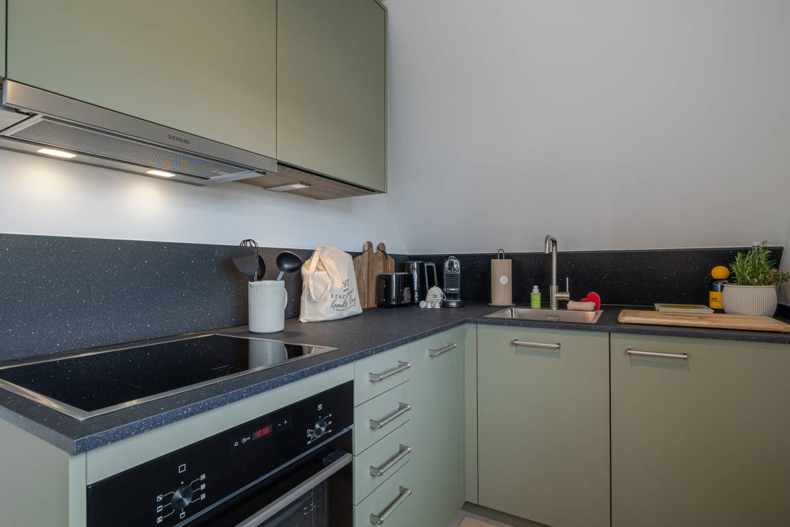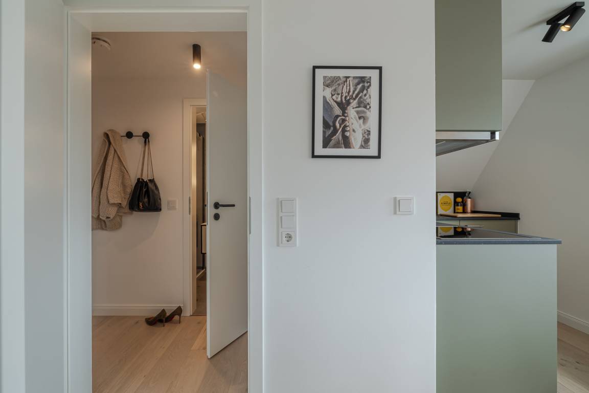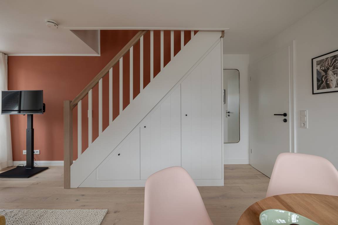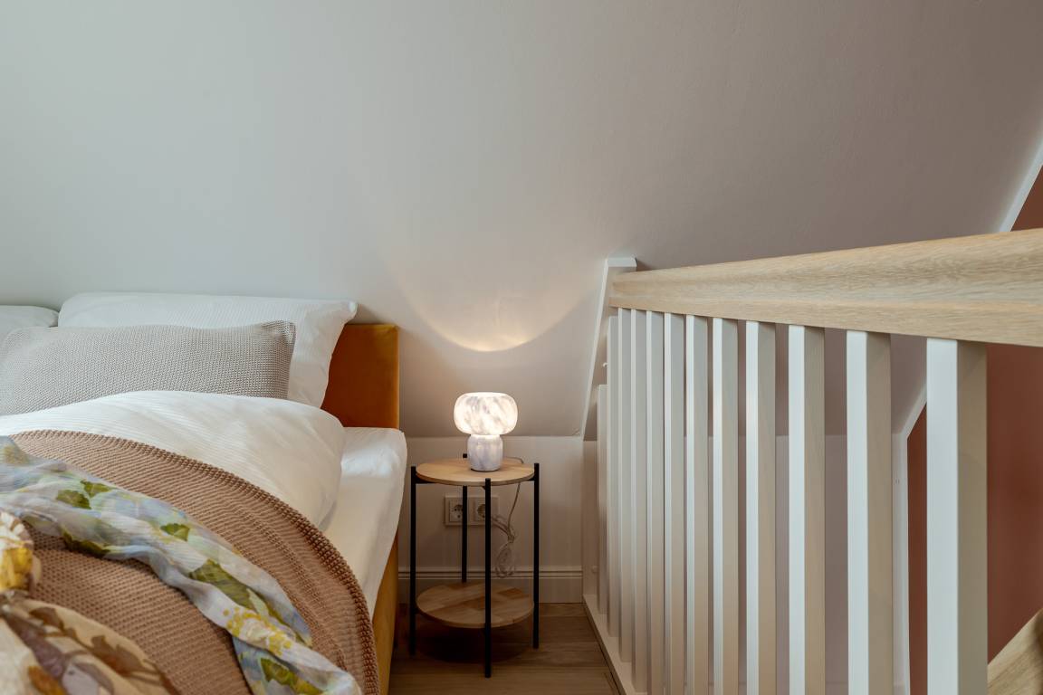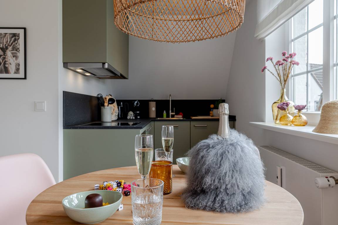 Runter vom Festland und rauf auf die Insel. Im neuen CPTN Nicolai Resort beginnt Ihr Sylt Urlaub genau dort, wo Ankommen leichtfällt. Mitten in Westerland erwartet Sie unsere frisch renovierte Kajüte #12 im Dock 6a. Auf 50 Quadratmetern im Obergeschoss bietet sie viel Raum für bis zu vier Personen und verbindet modernes Design mit nordischer Gemütlichkeit. Schon beim Eintreten spüren Sie die besondere Atmosphäre. Helle lichtdurchflutete Räume, warmes Eichenparkett und liebevoll ausgewählte Details schaffen ein Zuhause auf Zeit, das Ruhe und Inselgefühl vereint. Auf dem Mitteldeck befinden sich der großzügige Wohn und Essbereich sowie die offene Küche. Das moderne Sofa lässt sich bei Bedarf in eine zusätzliche Schlafmöglichkeit verwandeln. Die Küche ist mit Markengeräten unter anderem von Siemens ausgestattet und bietet alles, was Sie für ein entspanntes Frühstück oder ein gemeinsames Abendessen benötigen. Das Bad mit Regendusche, Fußbodenheizung und Handtuchwärmer wird schnell zu Ihrer kleinen Wellnessoase. Über die Treppe gelangen Sie auf das gemütliche Oberdeck mit hochwertigem Schramm Boxspringbett, maßgefertigten Einbauschränken und einer kleinen Sitzecke mit weiterem Schlafsofa. Von Mai bis Oktober lädt der möblierte Balkon dazu ein, den Tag an der frischen Nordseeluft zu beginnen oder ausklingen zu lassen. Als Gast nutzen Sie den 200 Quadratmeter großen Pool und Saunabereich in Dock 6d kostenfrei. Ein 12 mal 4 Meter Pool, eine moderne Sauna, ein Loungebereich und Fitnessgeräte stehen Ihnen zur Verfügung. Hunde sind herzlich willkommen. Ein kostenfreier Parkplatz gehört ebenfalls zu Ihrer Kajüte.