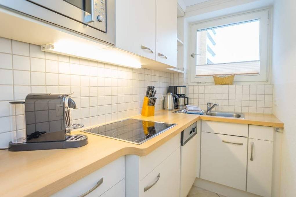 Die separate Küche hat einen Geschirrspüler, eine Mikrowelle mit Grillfunktion, ein Ceranfeld mit 4 Kochfeldern, ein Kühlschrank mit 3*-Gefrierfach, eine Kapselmaschine und ein Fenster. Kaffeemaschine, Wasserkocher und Toaster gehören zur Grundausstattung.