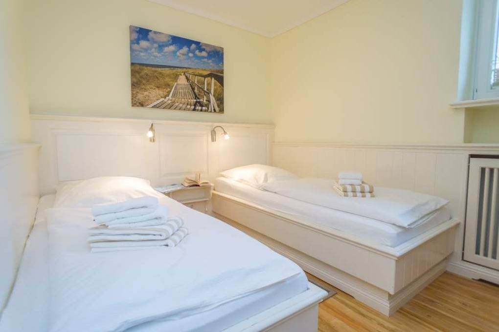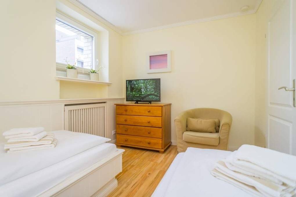 Das Schlafzimmer ist mit zwei auseinander stehenden Einzelbetten und einem Fernseher ausgestattet.