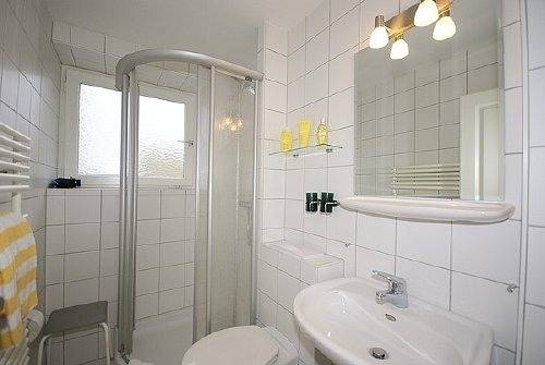 Im Bad befinden sich eine Dusche, ein WC, ein Waschtisch, ein Handtuchtrockner und ein Fenster.