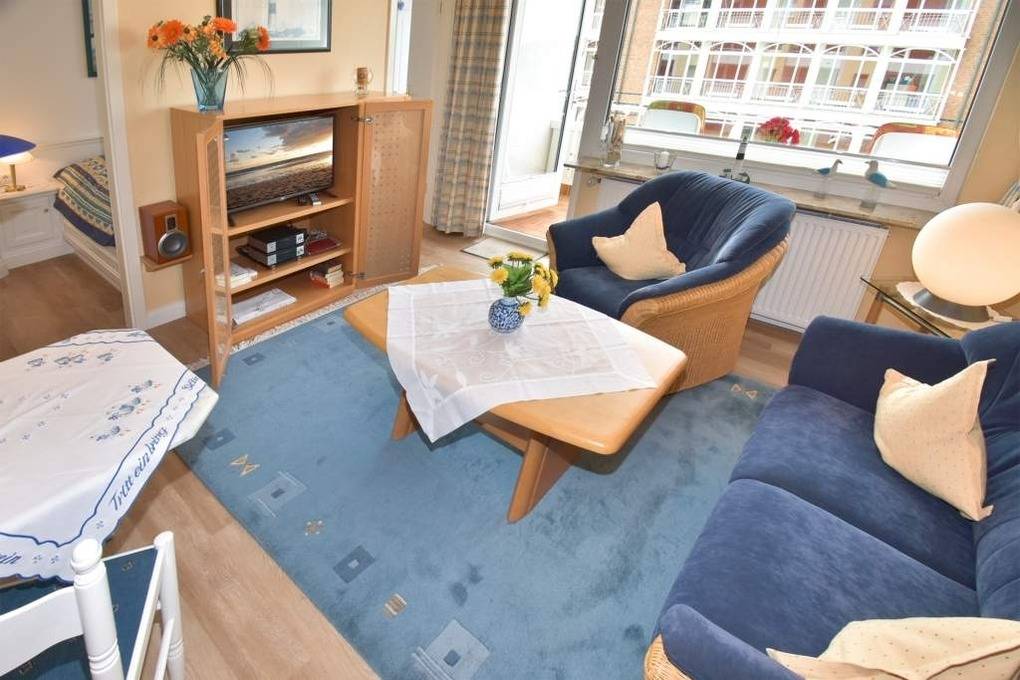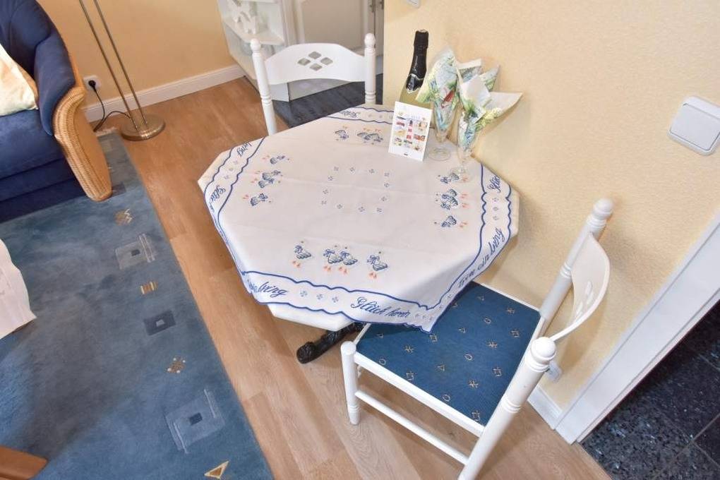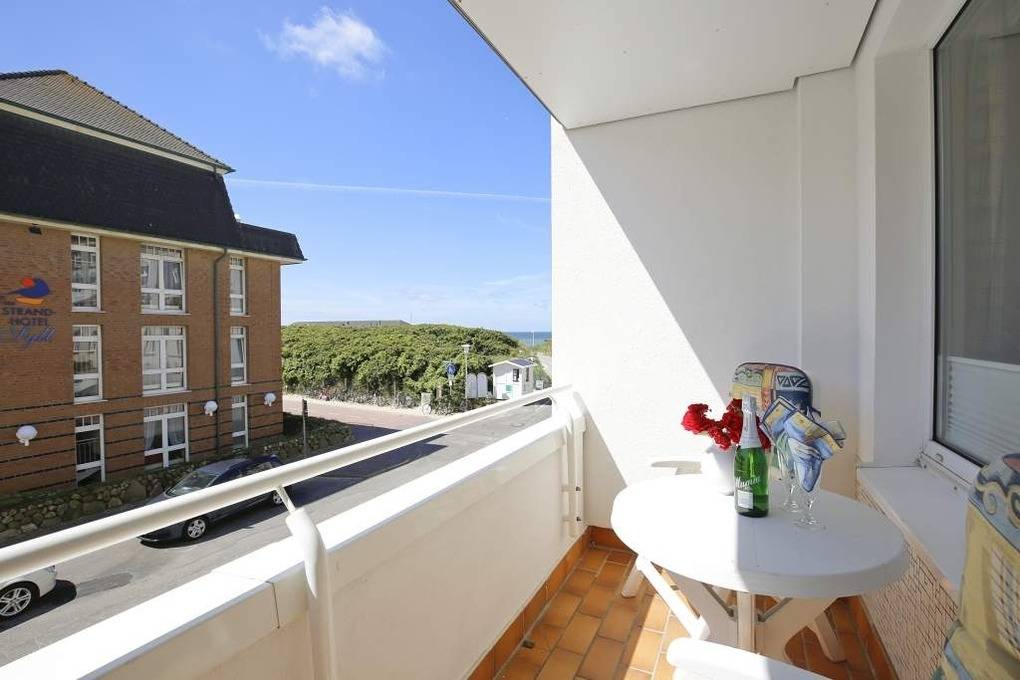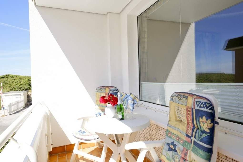 2-Zimmer-Nichtraucher-Ferienwohnung, ca. 38 qm, in der 1. Etage mit Meerblick vom Südbalkon (Nachmittagssonne, mit Balkonmöbeln und Auflagen) für max. 2 Personen.