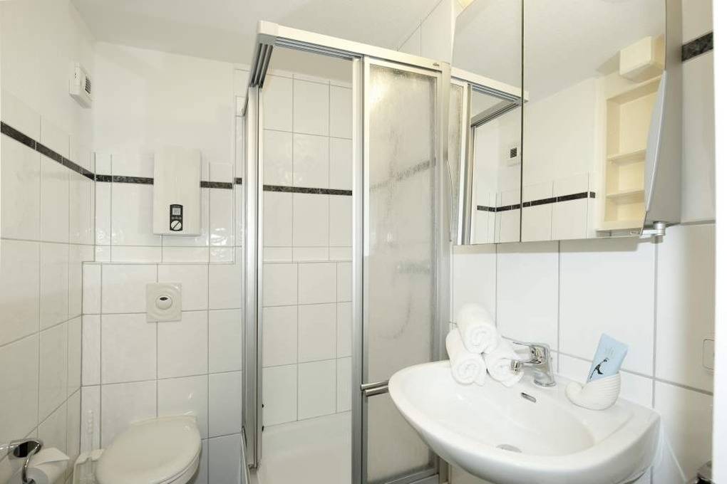 Das Bad ist ausgestattet mit einer Dusche, einem WC, einem Waschtisch, einem Fön und einem Handtuchtrockner.