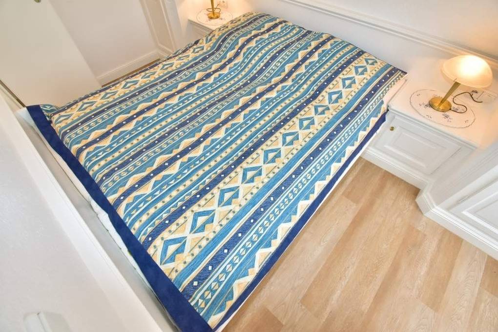 Das Schlafzimmer hat ein gutes Doppelbett (normales Maß: 1,60 x 2,00[nbsp][nbsp]m) mit Einzelmatratzen und einem Kleiderschrank.