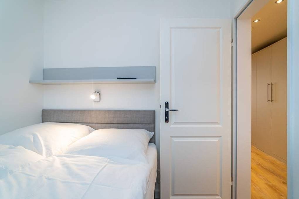 Das Schlafzimmer ist mit einem Boxspringbett (Liegefläche: 1,40 m x 2,00 m, durchgehende Matratze, einseitiger Einstieg) ausgestattet.