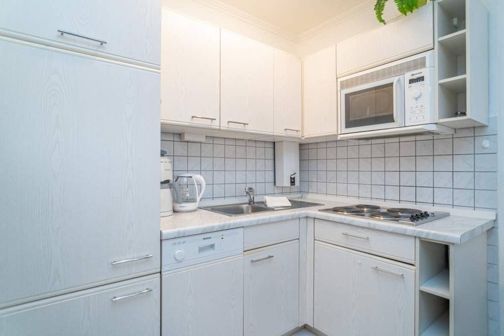 Die Küchenzeile hat einen Geschirrspüler, ein 4-Platten-Kochfeld und einen Kühlschrank mit 4*-Gefrierfach. Kaffeemaschine, Wasserkocher und Toaster gehören zur Grundausstattung.