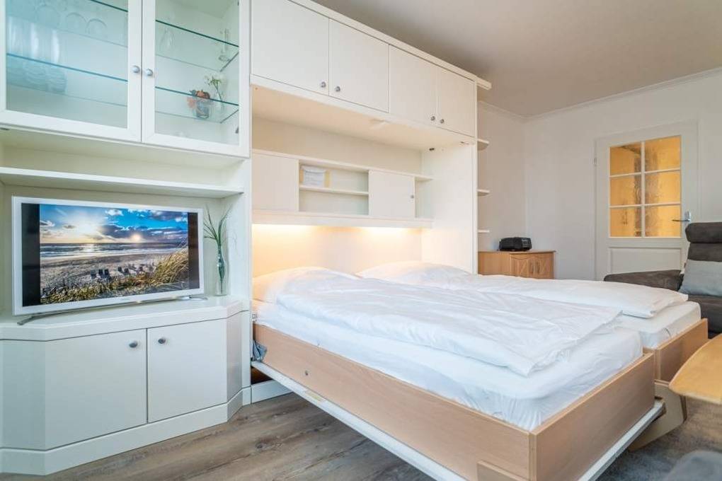 Der Wohnraum besteht aus einer Sitzecke, einem Essplatz, einem Doppelschrankbett (Betten einzeln klappbar) und einem Sat-Flachbild-TV.