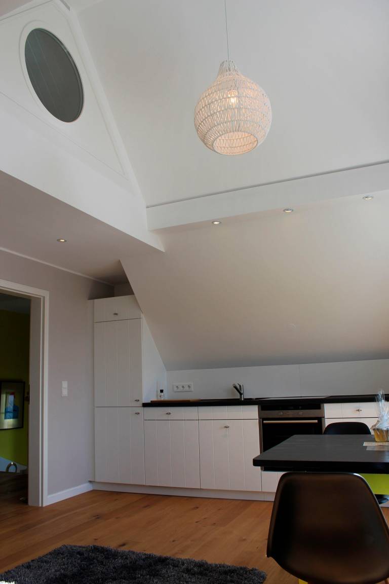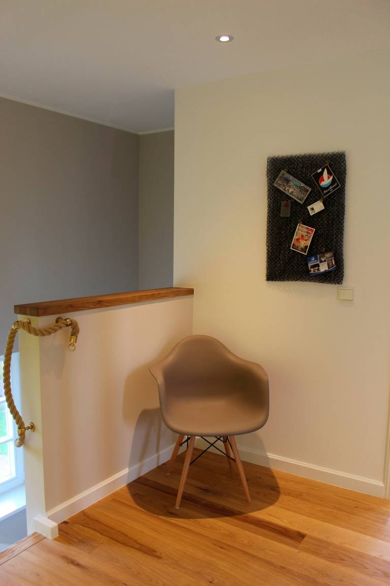 Die Wohnung befindet sich im Obergeschoss eines Friesenhauses, in einer verkehrsberuhigten Strasse auf einem sehr grosszügigen Grundstück. Die Wohnung hat ihren eigenen Hauseingang. Sie haben Zugang zum Garten und einer Terrasse und die Kinder haben eine grosse Wiese zum Spielen.