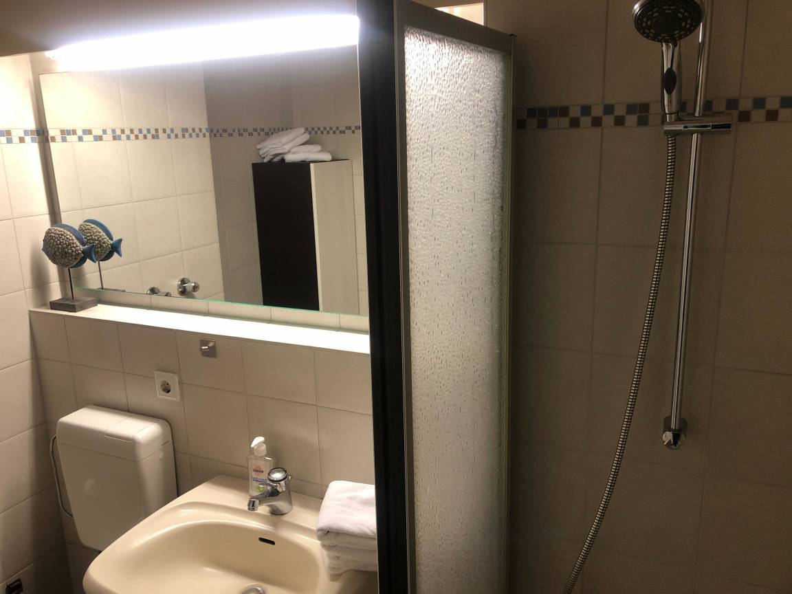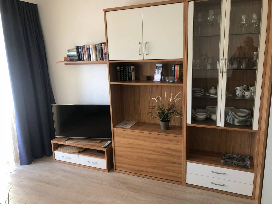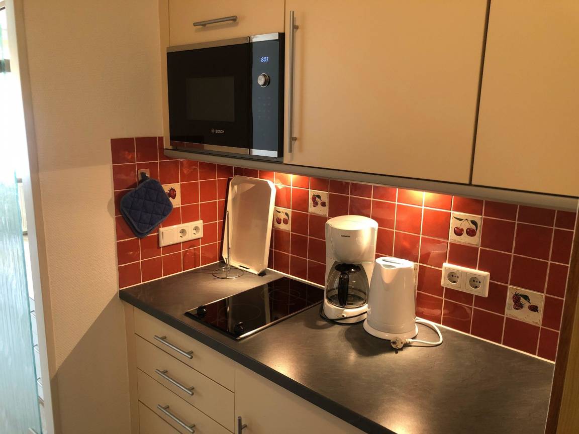 Die moderne Einbauküche verfügt über Herd, Kühlschrank, Geschirrspüler und eine Mikrowelle. Das Bad ist funktionell eingerichtet. Das Wohn-Schlafzimmer ist hell und geräumig und wurde erst kürzlich komplett neu ausgestattet. Das Bettsofa ist Anfang 2018 ausgetauscht worden. Selbstverständlich verfügt das Appartement über eine Stereoanlage, einen Flachbildschirm-Fernseher und über W-Lan.