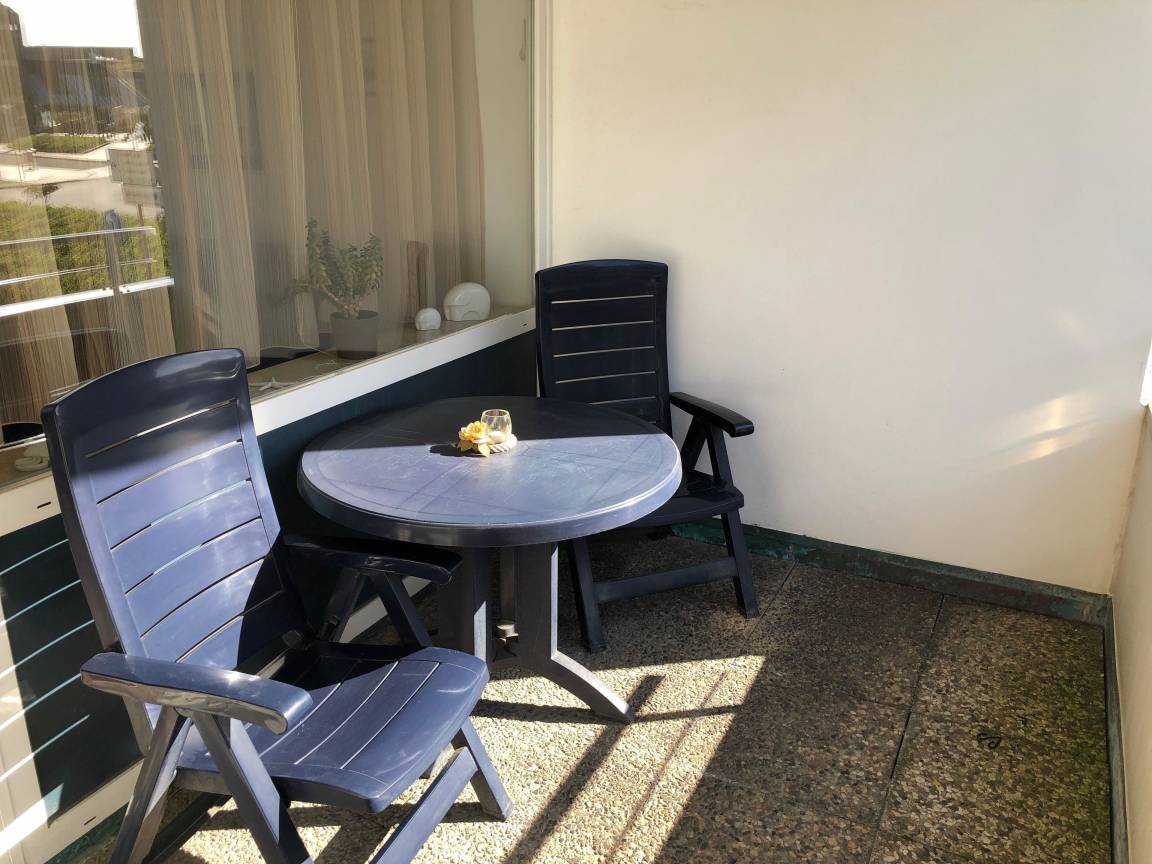 Die Loggia des Appartementes ist nach Westen ausgerichtet und fängt die Abendsonne ein. Bequeme Sessel und einen Balkontisch sind die ideale Ausstattung für einen Sundowner nach einem Tag auf Sylt.