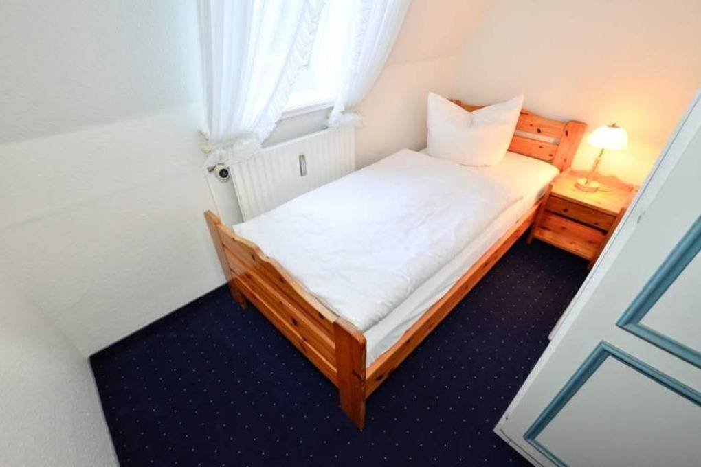 Das kleine Schlafzimmer hat ein gutes Einzelbett, einen Kleiderschrank und einen Nachttisch.