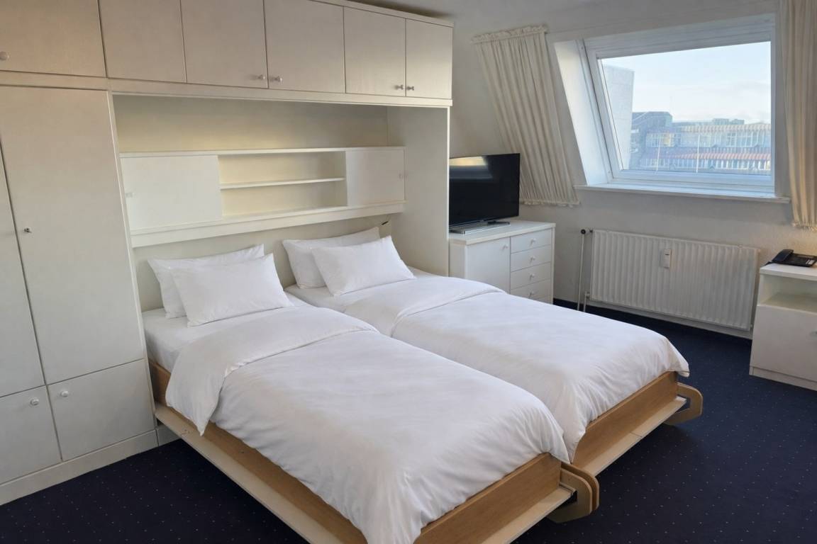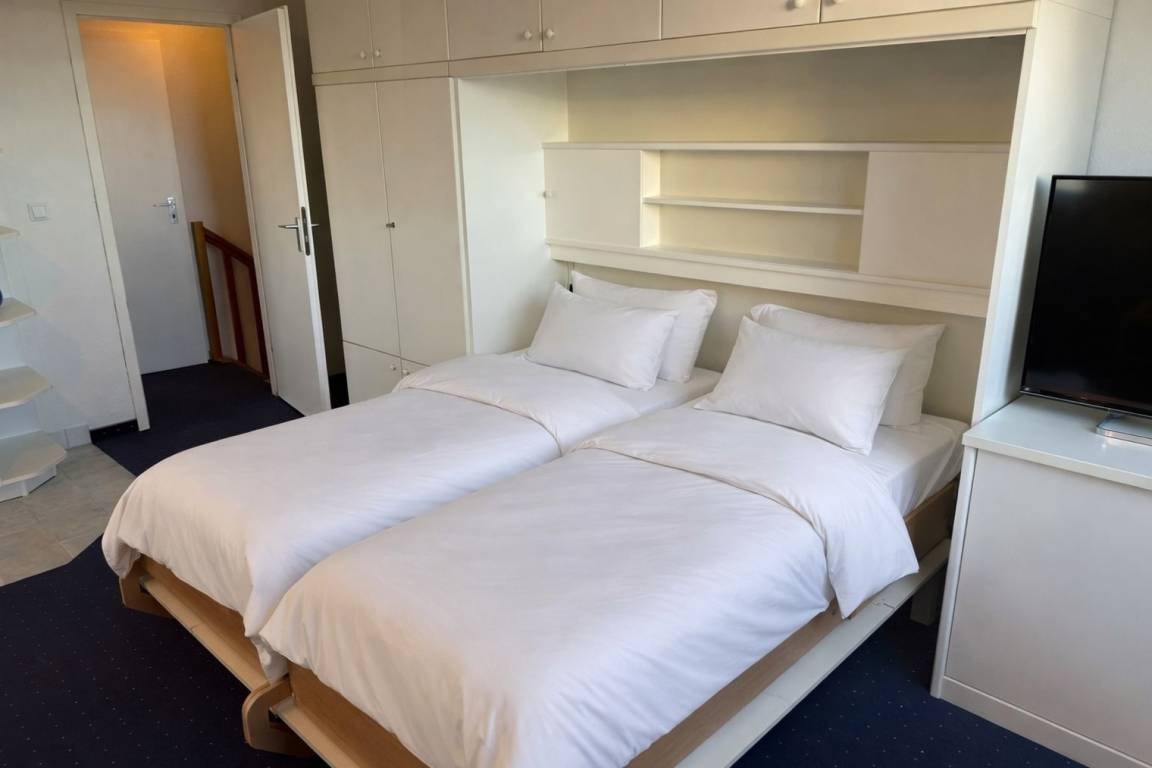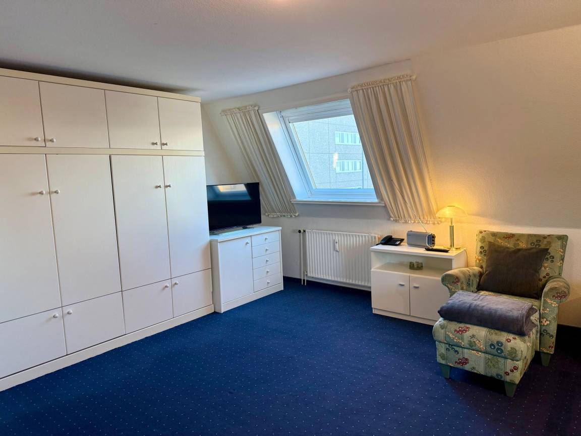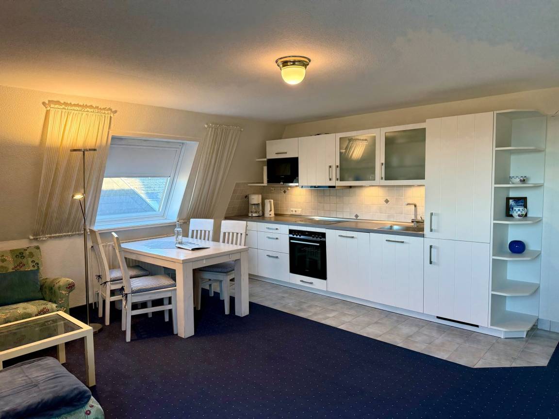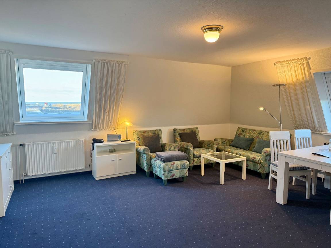 Der Wohnraum besteht aus einer besonders hochwertigen Sitzgarnitur von Bielefelder Werkstätten (2-Sitzer-Couch und zwei bequeme Ohrensessel), einem Doppelschrankbett, einem Essplatz, Kabel-Flachbild-TV, HiFi-Anlage, Telefon und einer neuen, offenen Küchenzeile.