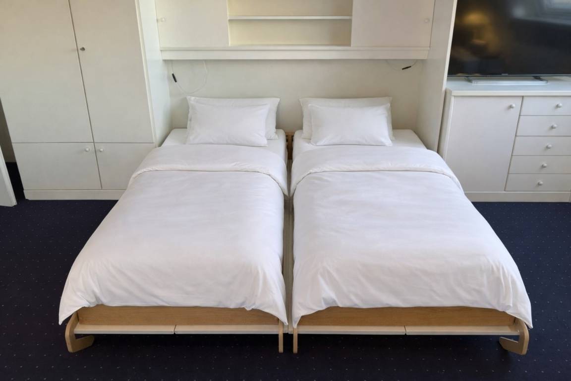 Das Schlafzimmer hat ein gutes Doppelbett (Liegefläche 2 x 2 m, mit 2 Einzelmatratzen), Nachtschränke, zwei Stühle und einen Kleiderschrank.