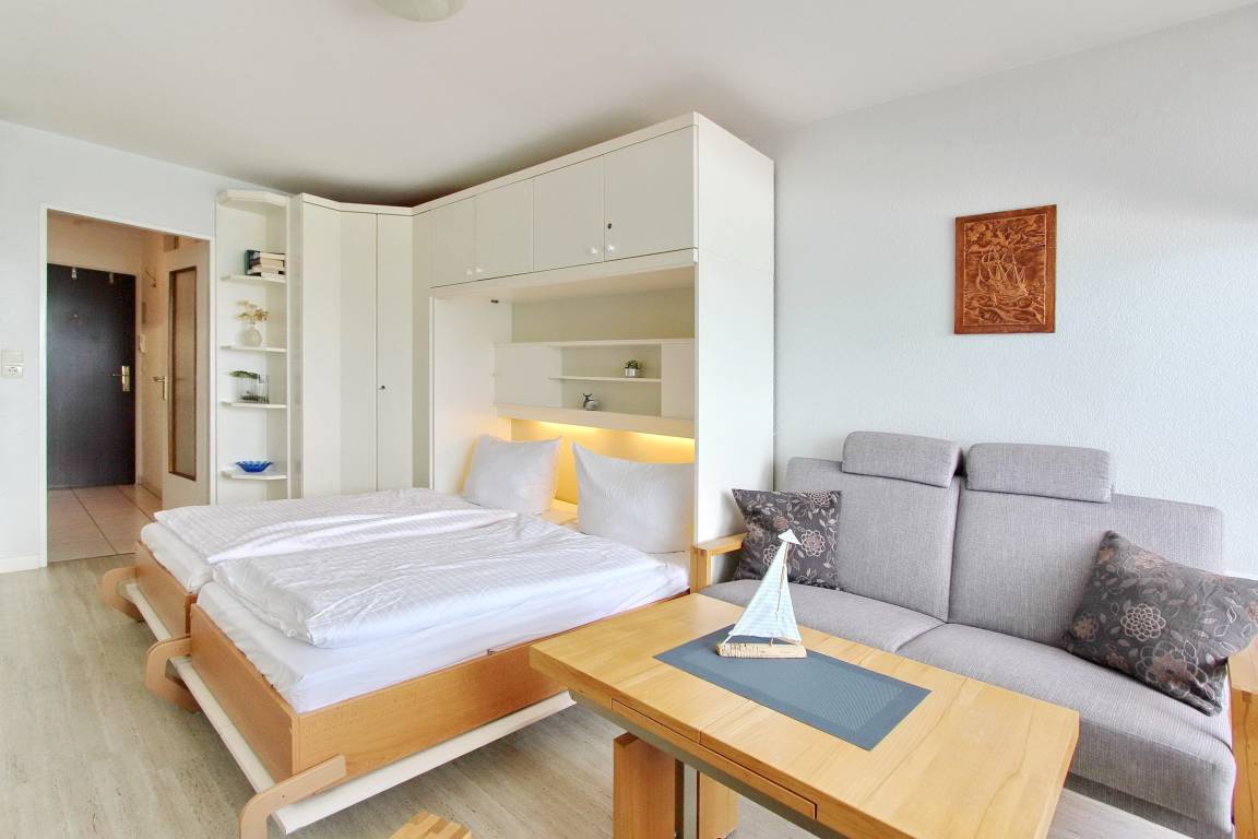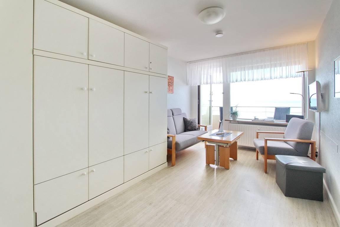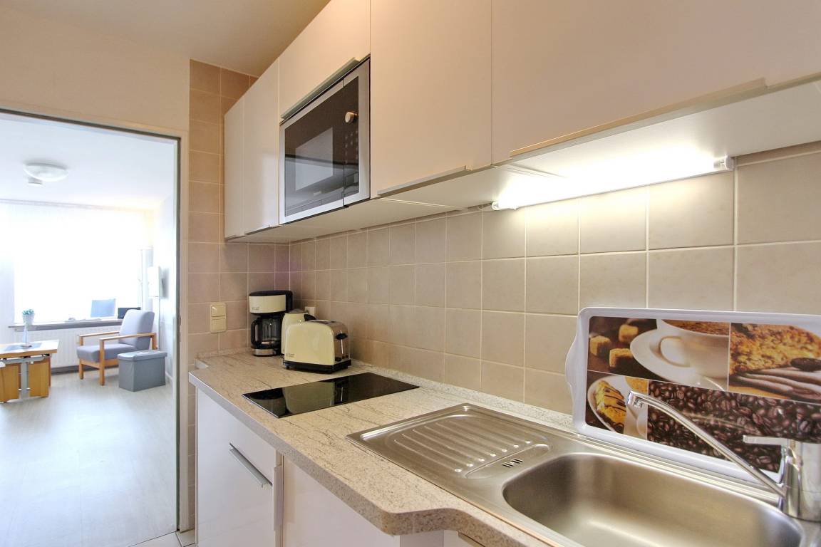 Kleine, aber mit viel Liebe zum Detail eingerichtete Einzimmerwohnung in der 9. Etage im Haus Metropol mit wunderschönem Strand- und Nordseeblick. Der kombinierte Wohn-/Schlafraum mit vorgelagertem Westbalkon ist eingerichtet mit Einzelschrankbetten, Designfussboden, 2 Sitzercouch mit Wohn-Esstisch und Fernsehsessel. Auf dem Balkon gibt es zwei Hochlehnerstühle mit Auflagen und einen Tisch. Das Badezimmer hat eine Dusche mit festem Haltegriff und Hocker. In der Einbauküche mit Mikrowelle, Ceranfeld (2 Platten) und Geschirrspüler können sie sich selbst verpflegen. Zur technischen Ausstattung gehört: ein Smart- TV mit integriertem Radio und eine Bluetoothanlage mit CD Player. Ein freies WLAN Netzwerk (WEG Haus Metropol - Passwortfrei - ohne Gewähr) steht ihnen kostenfrei zur Verfügung. Diese Nichtraucherwohnung hat eine Größe von ca. 25 m².