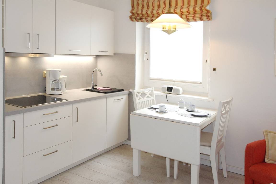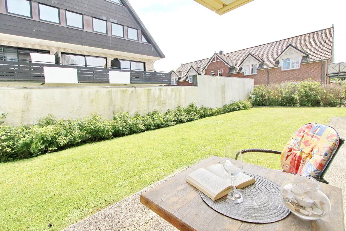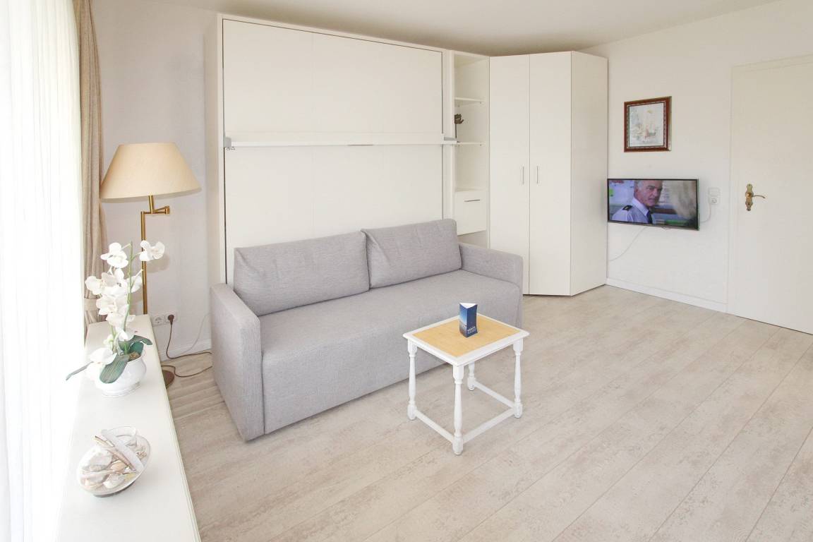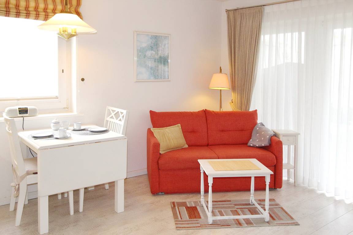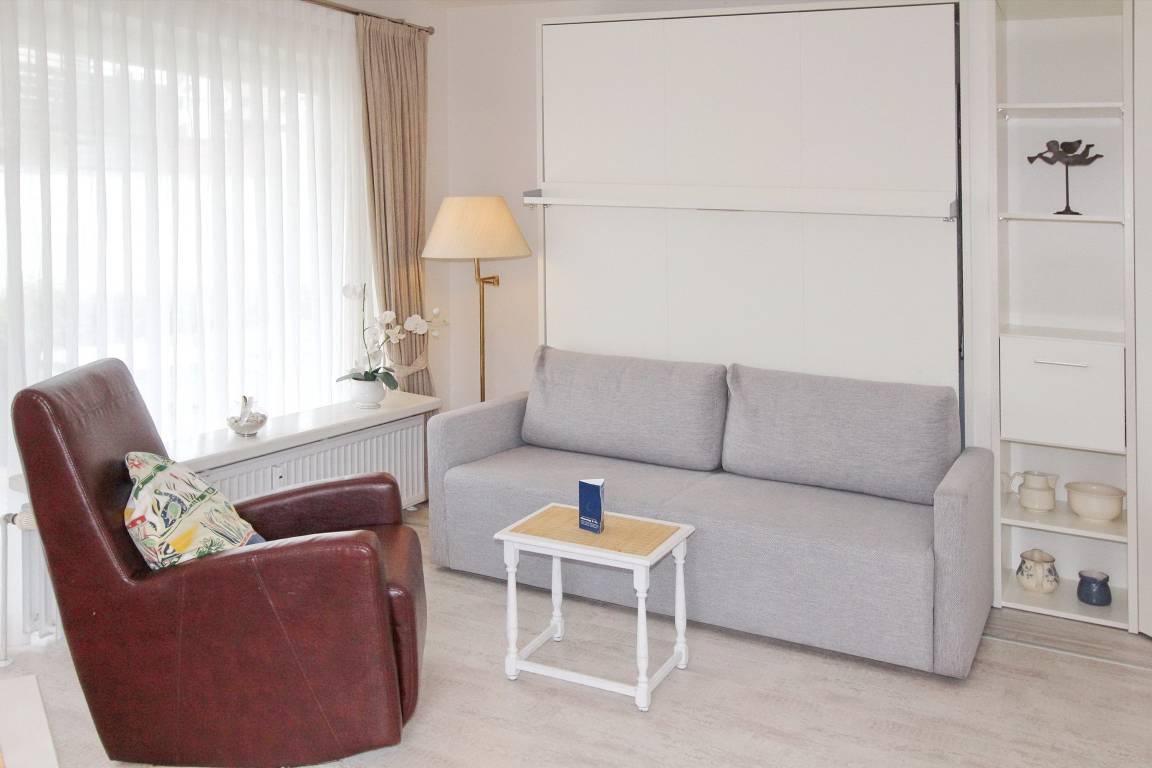 Einzimmerwohnung im Erdgeschoss, mitten in der Westerländer Innenstadt mit Ostterrasse, Strandkorb und kleinem Gartenanteil. Der kombinierte Wohn-/Schlafraum ist eingerichtet mit einem Doppelschrankbett, einem Essplatz mit 2 Stühlen, einer Couch und Fernsehsessel. In der offenen Einbauküche gibt es ein Ceranfeld und eine Dunstabzugshaube. Im Wohnraum wurde hochwertiger Laminatfußboden verlegt. Das 2021 neu renovierte Badezimmer hat eine Dusche mit niedrigem Einstieg, einen Fön und den Vorteil eines Fensters zur direkten Belüftung. Zur technischen Ausstattung dieser Wohnung gehört: ein moderner 32 Zoll Flachbildfernseher von Panasonic und ein Radio. Garage 6 steht Ihnen kostenfrei zur Verfügung. Im Haus befindet sich ein Wasch-und Trockenautomat mit Münzeinwurf. Diese Nichtraucherwohnung hat eine Größe von ca. 35 m².