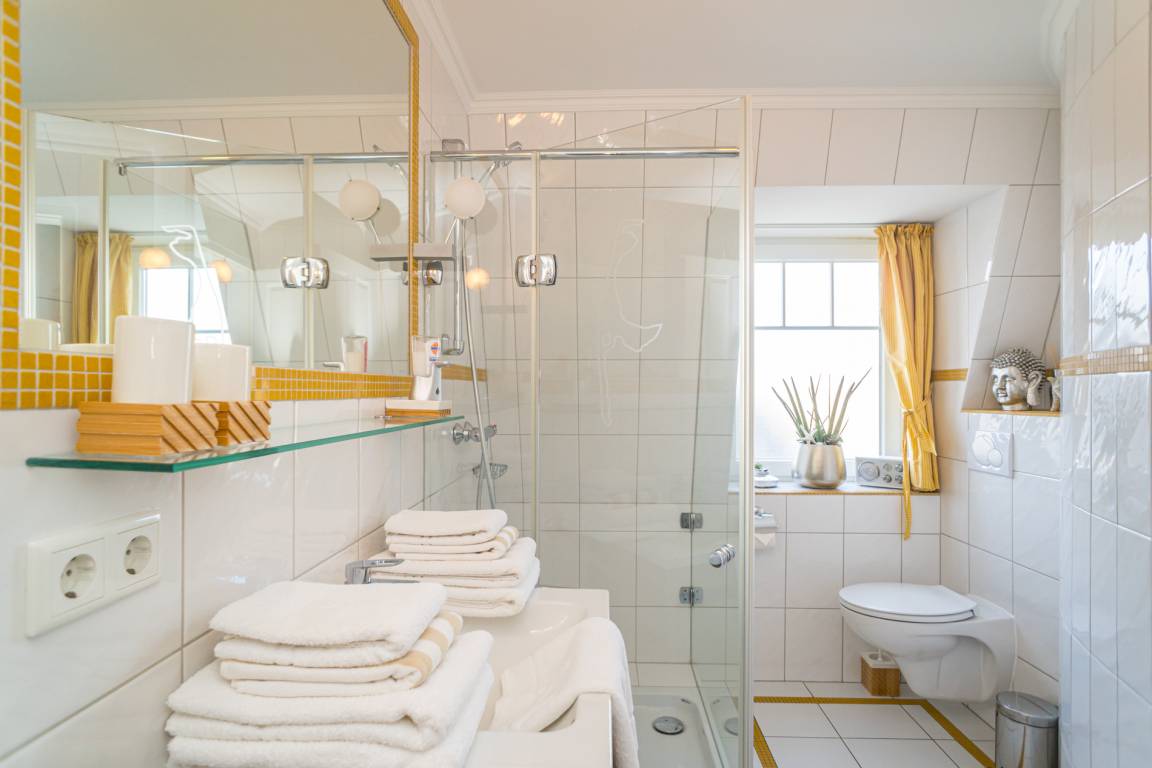 Das moderne neuwertige Badezimmer mit Fenster ist perfekt für einen guten Start in den Urlaubstag. Es besitzt eine Dusche mit extraflachem Einstieg, einen Waschtisch, Handtuchtrockner, WC sowie Fön.