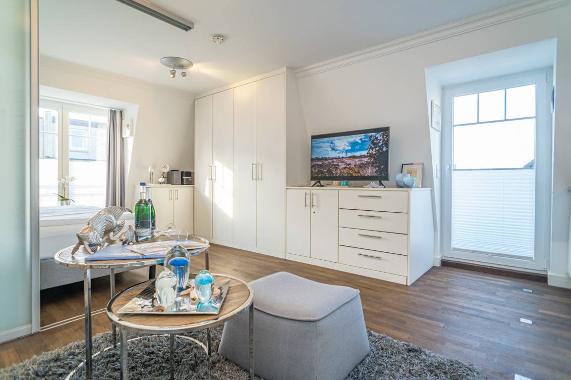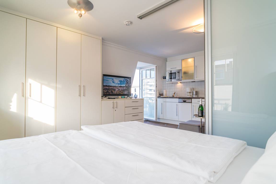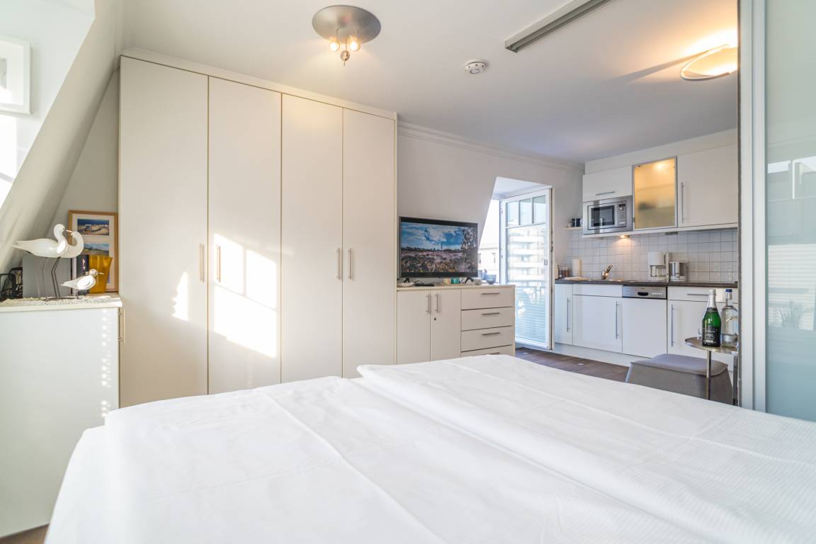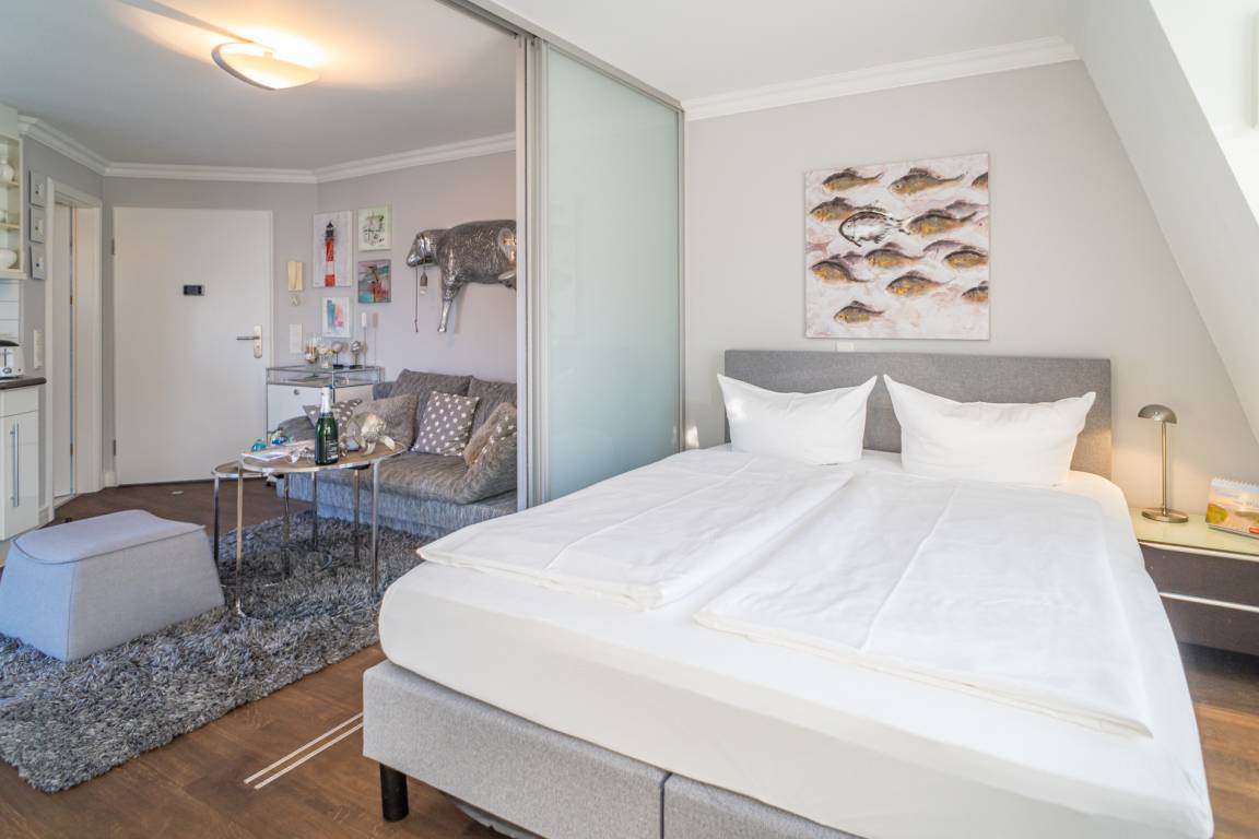 Die exklusive, mit Designerboden ausgelegte 1-Zimmer-Nichtraucher-Ferienwohnung (ca. 33 qm) in der 3. Etage mit Nordwest-Balkon (mit Balkonmöbeln und Auflagen) ist ideal für 2 Personen geeignet.