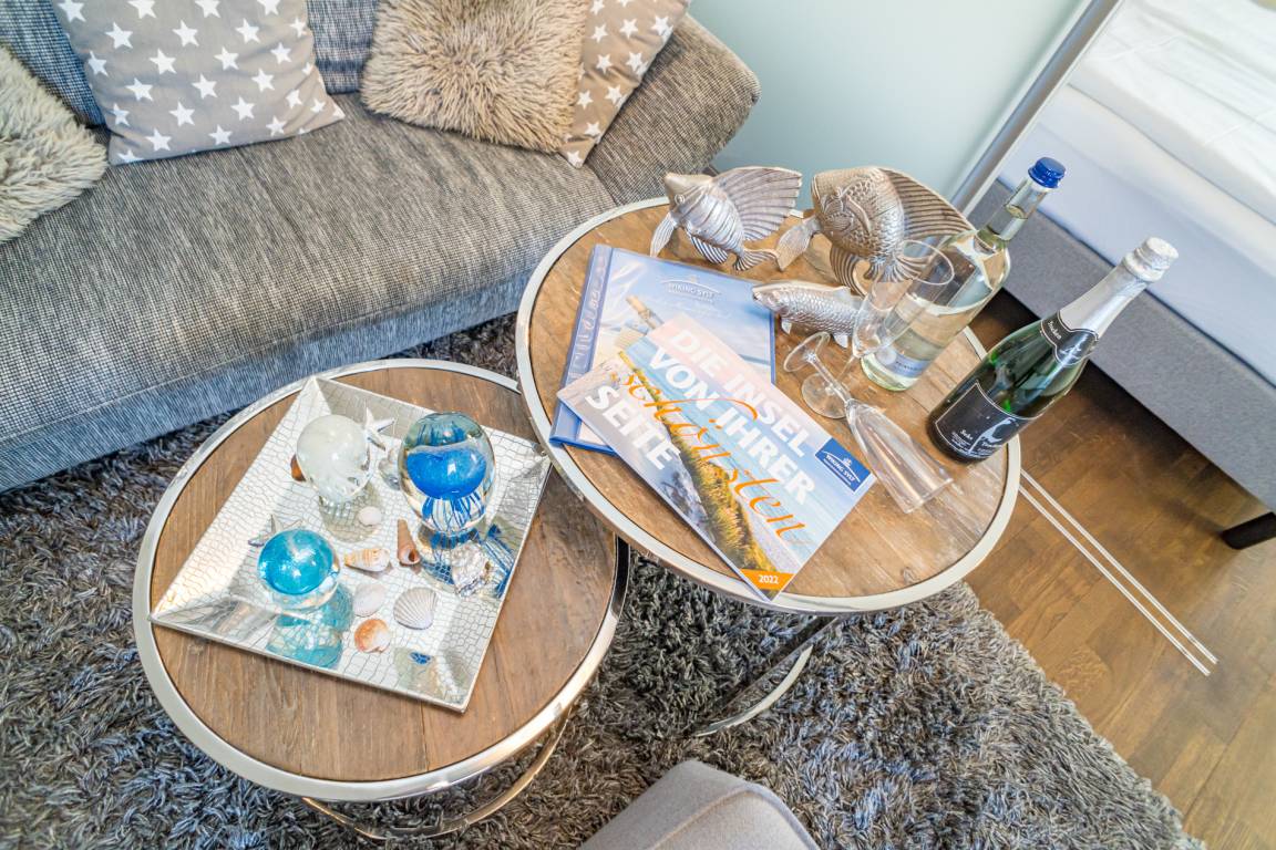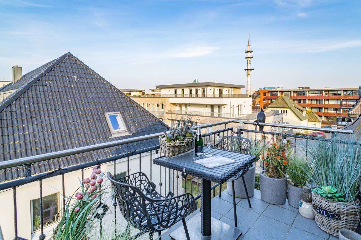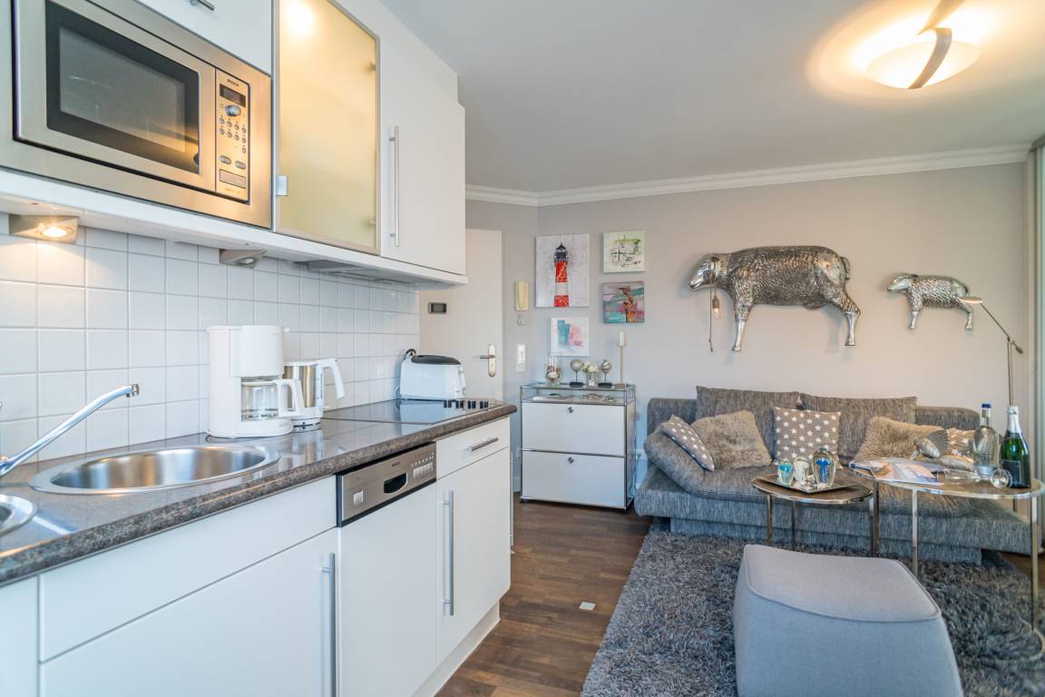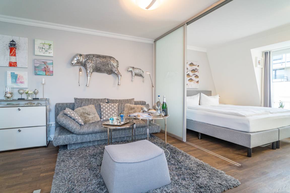 Die exklusive, mit Designerboden ausgelegte 1-Zimmer-Nichtraucher-Ferienwohnung (ca. 33 qm) in der 3. Etage mit Nordwest-Balkon (mit Balkonmöbeln und Auflagen) ist ideal für 2 Personen geeignet.