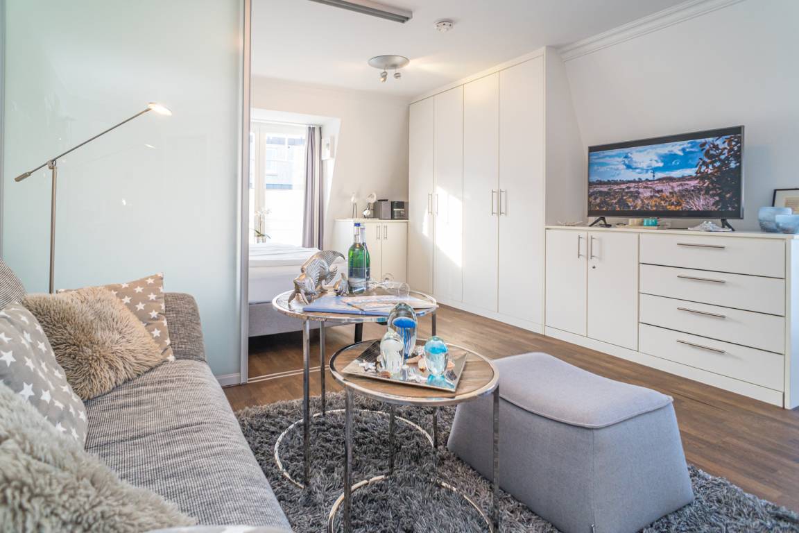 Der Wohn-/Schlafraum ist mit einer gemütlichen Sitzgarnitur, einem hochwertigen Boxspringbett (Liegefläche 1,60 x 2 m, mit zwei Einzelmatratzen und durchgehendem Topper), Flachbild-TV, HiFi-Anlage, Telefon inklusive Flatrate für Gespräche ins deutsche Festnetz (Handynummern gesperrt) und W-Lan ausgestattet.