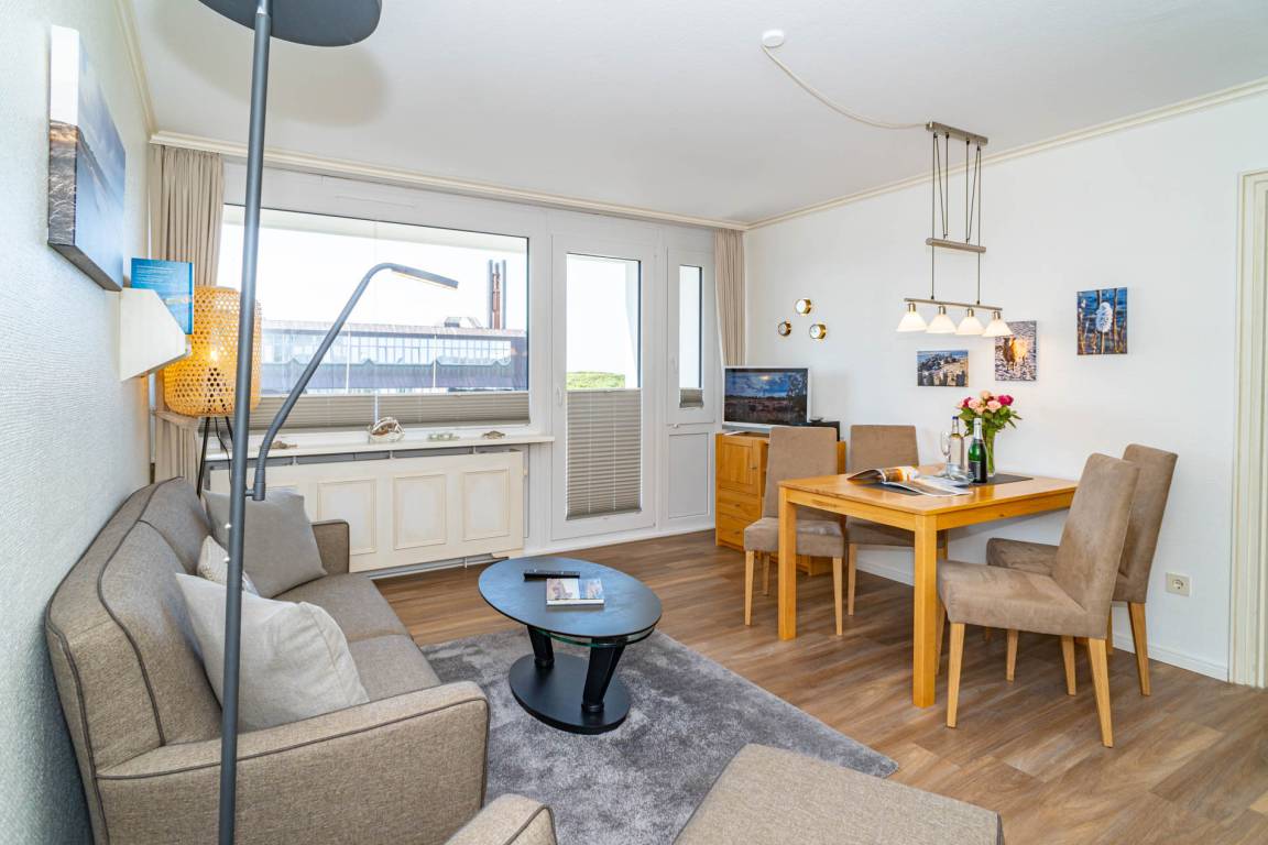Der Wohnraum besteht aus einer gemütlichen Sitzgarnitur (Zweisitzer und 2 Sessel), einem Essplatz,[nbsp] Flachbild-TV, DVD.