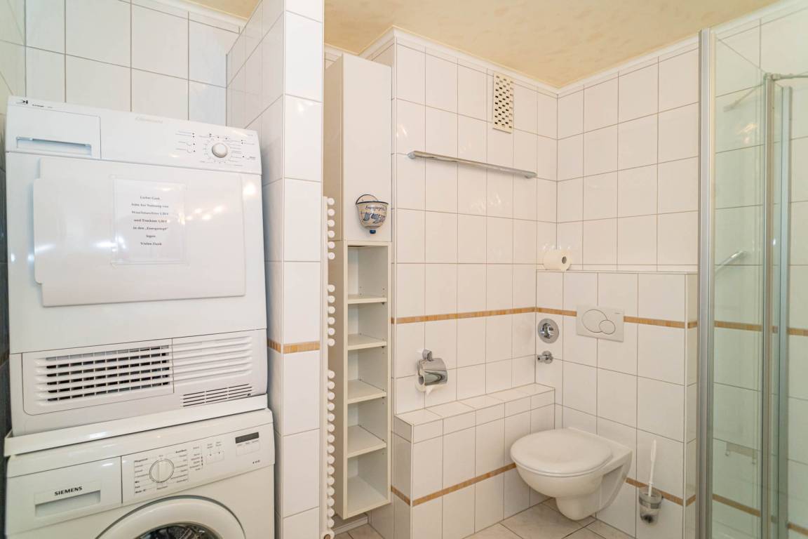 Im neuen Bad befinden sich eine Dusche, ein WC, ein Waschtisch und ein Fön. Waschmaschine und Trockner im Appartement vorhanden (gegen Entgelt)