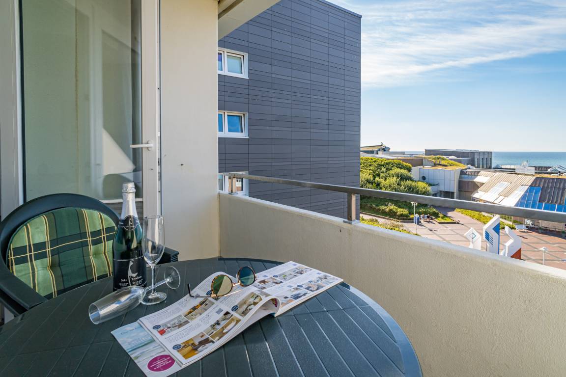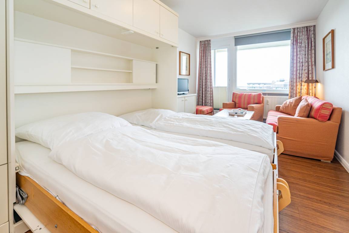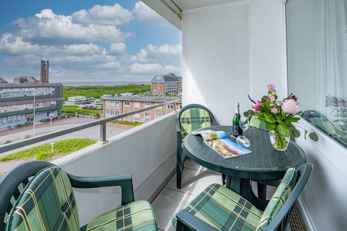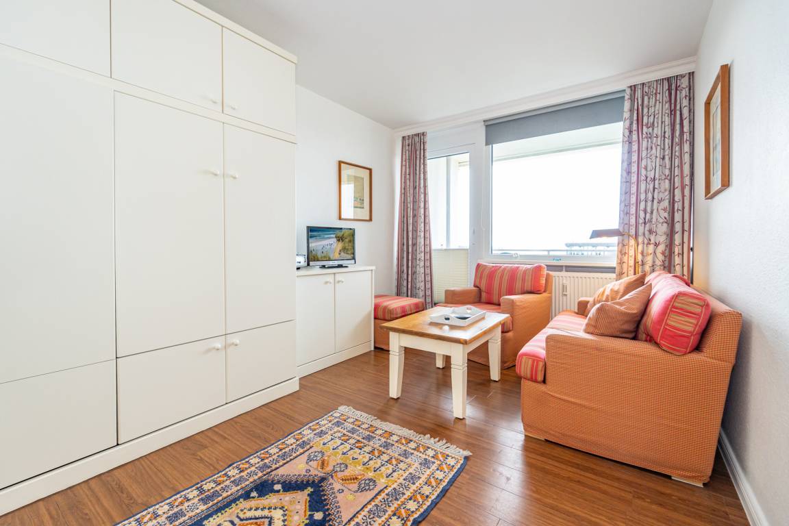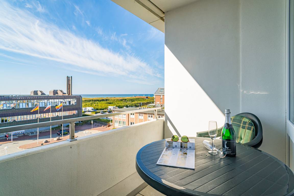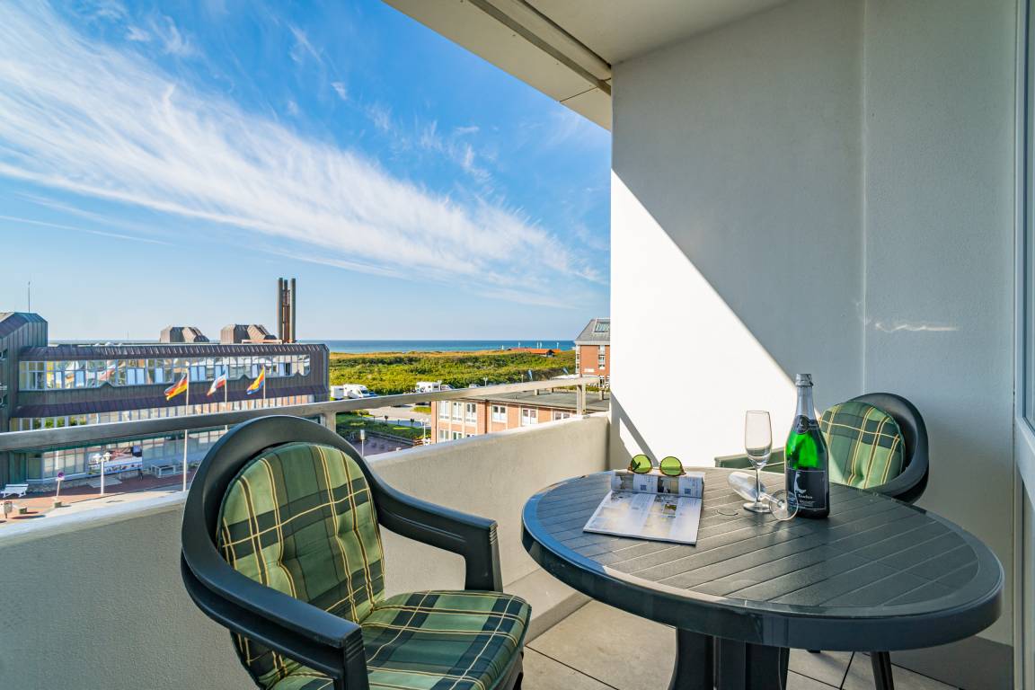 1-Zimmer-Nichtraucher-Ferienwohnung (ca. 25 qm) in der 4. Etage zur Seeseite mit Westloggia und Meerblick (Abendsonne, mit Balkonmöbeln und Auflagen) für max. 2 Personen.
