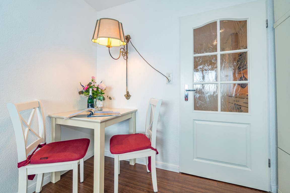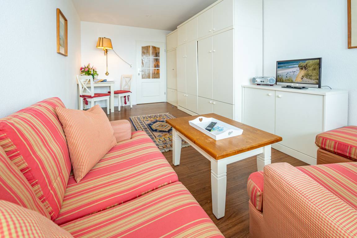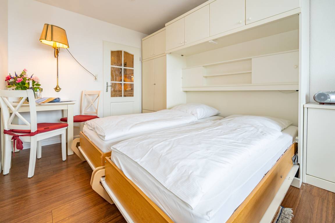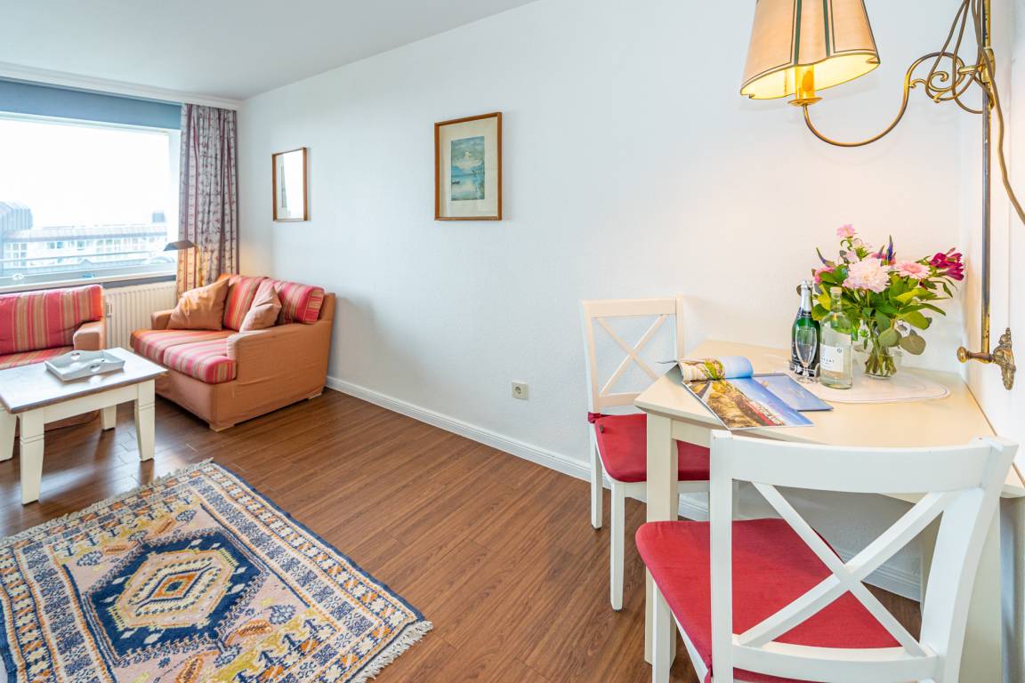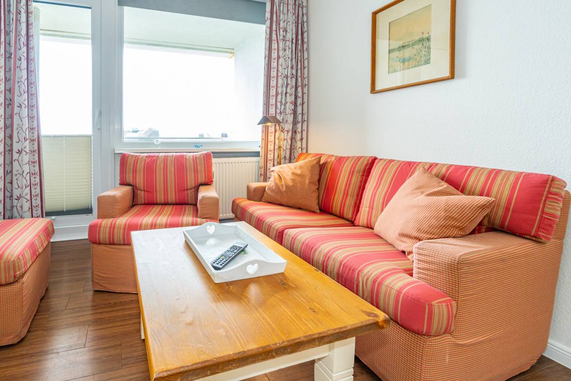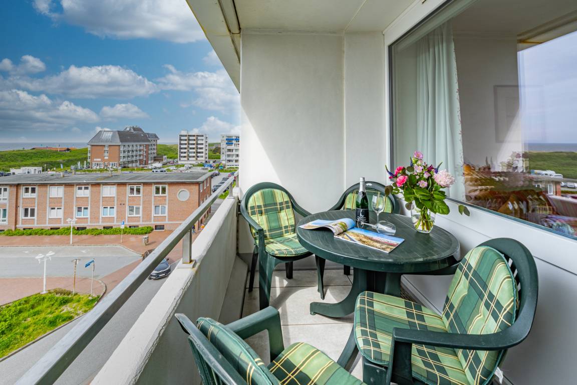 1-Zimmer-Nichtraucher-Ferienwohnung (ca. 25 qm) in der 4. Etage zur Seeseite mit Westloggia und Meerblick (Abendsonne, mit Balkonmöbeln und Auflagen) für max. 2 Personen.