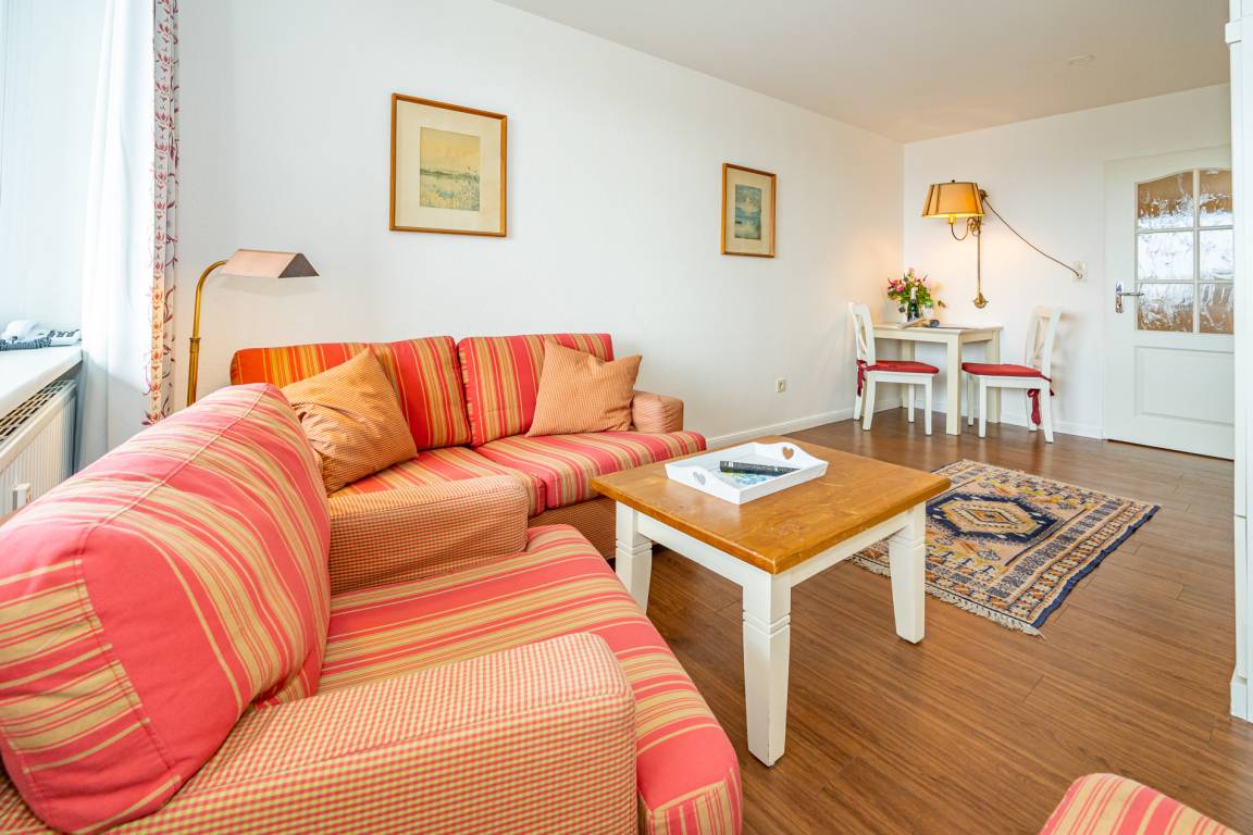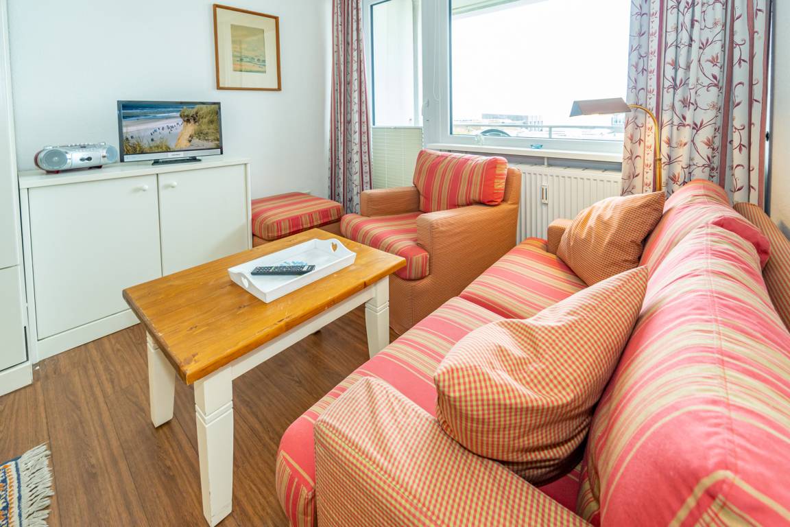 Der Wohn-/Schlafraum besteht aus einer Sitzgarnitur (Zweisitzer und Sessel), einem Essplatz, Doppelschrankbetten (einzeln aufklappbar), Kabel-Flachbild-TV, Radio.
