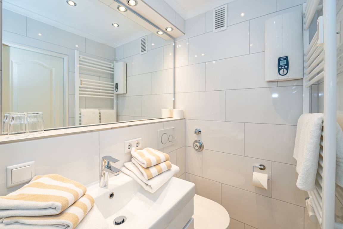 Im Bad befinden sich eine Dusche, ein WC und ein Waschtisch.