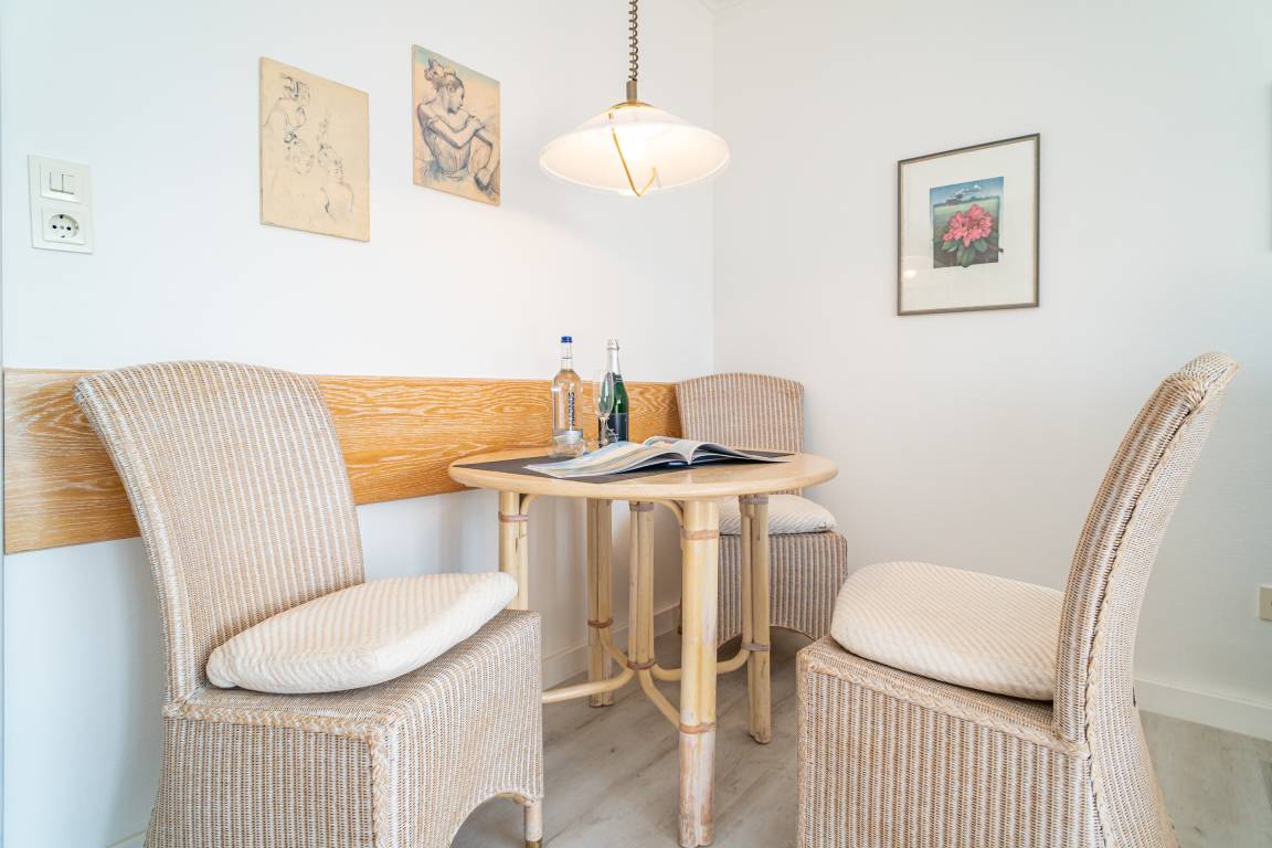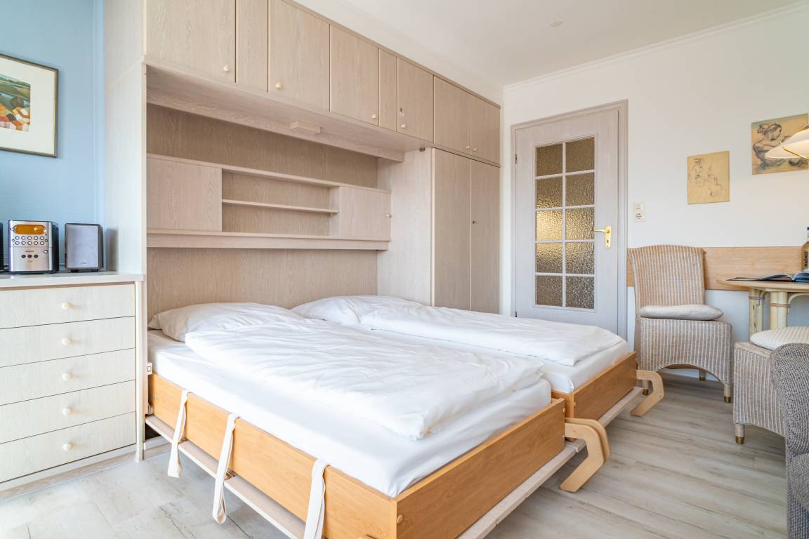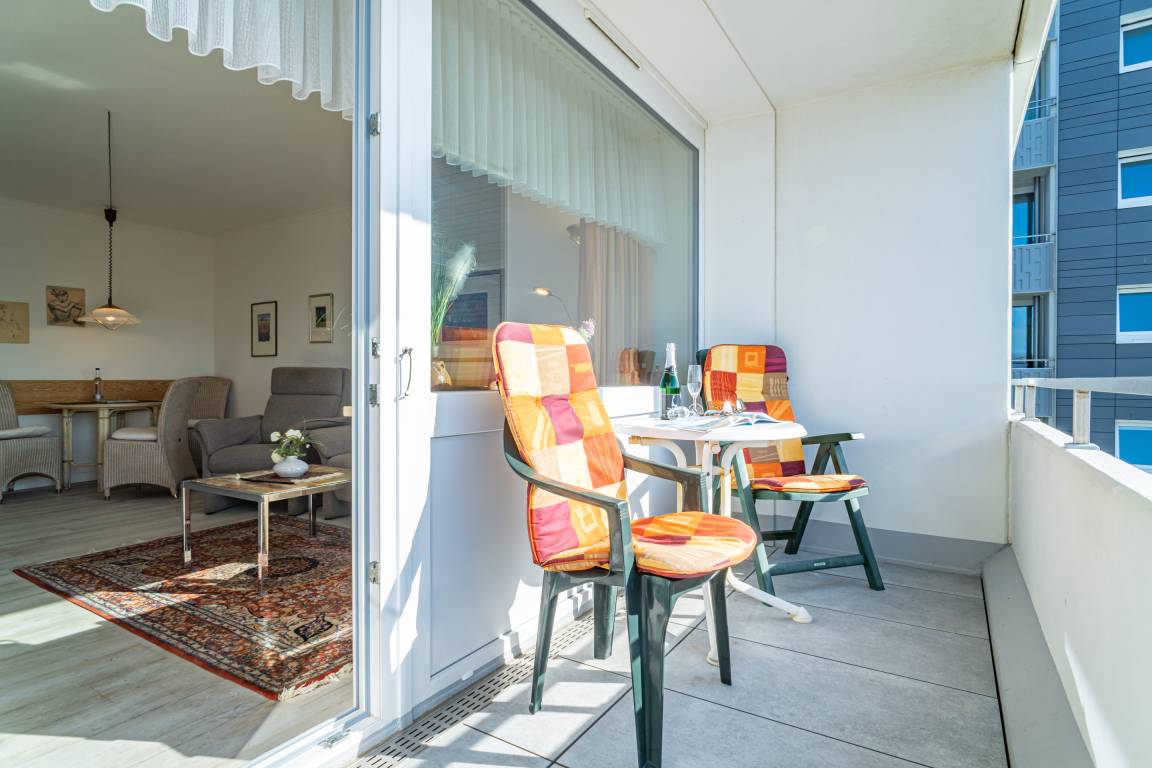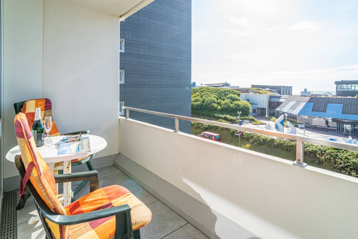 Gemütliche 1-Zimmer-Nichtraucher-Ferienwohnung (ca. 32 qm) in der 3. Etage mit Westloggia und Meerblick (Nachmittagssonne, mit Balkonmöbeln und Auflagen) für max. 2 Personen.