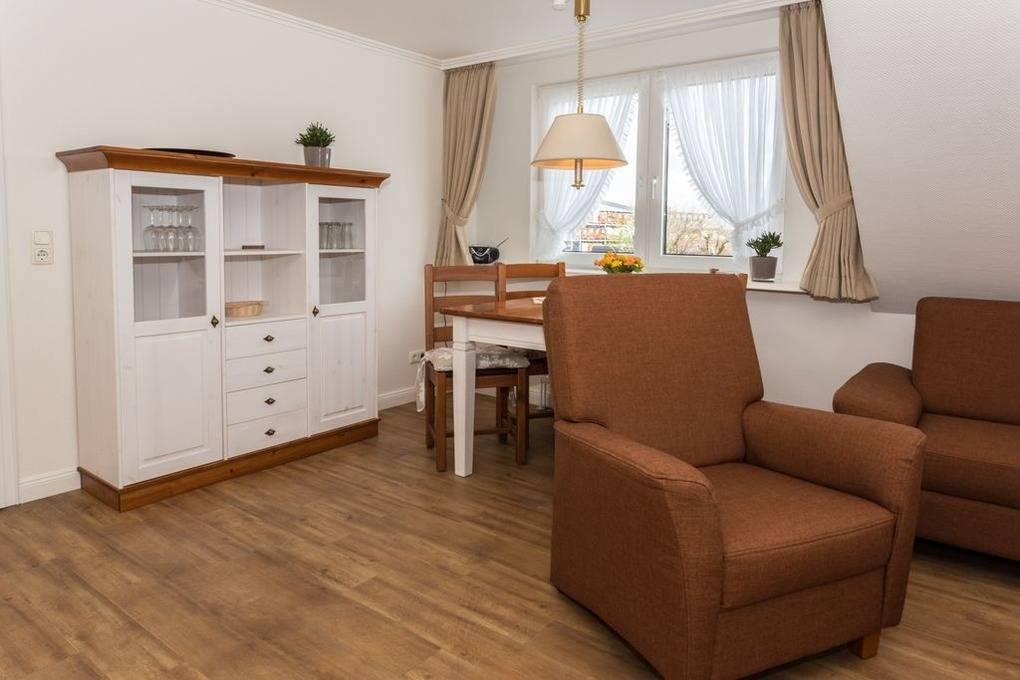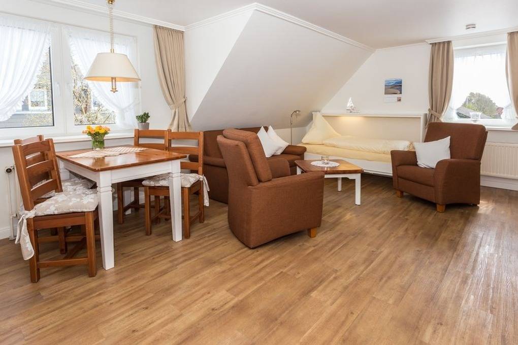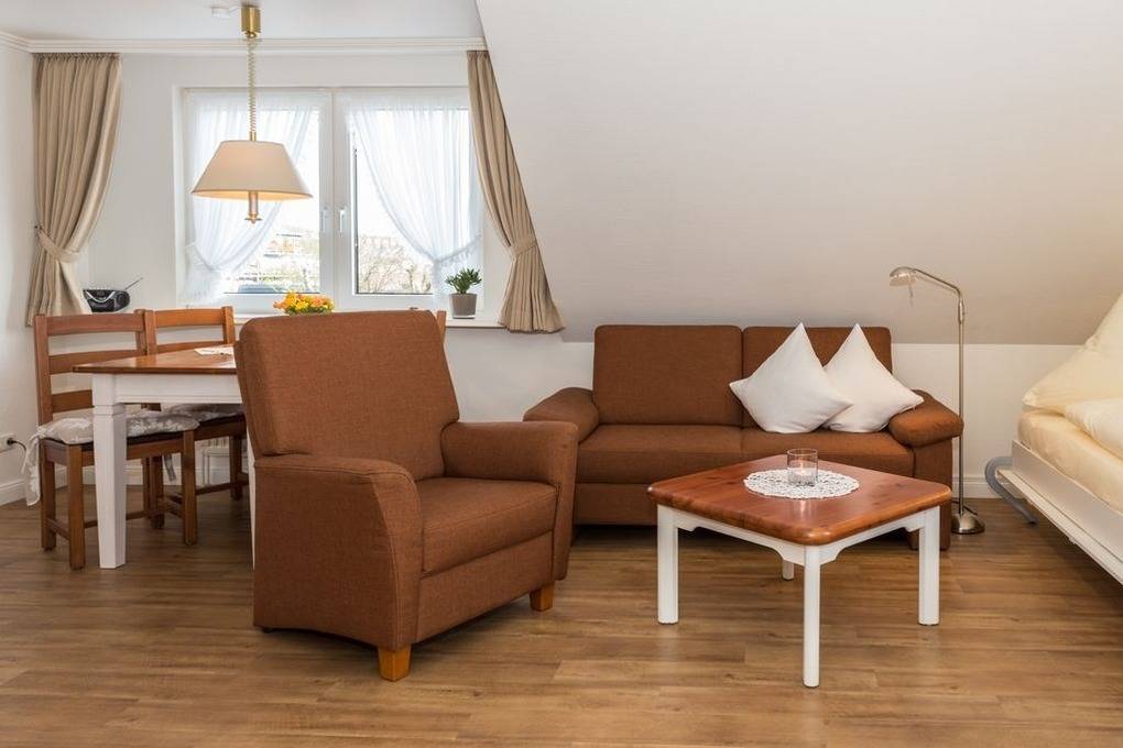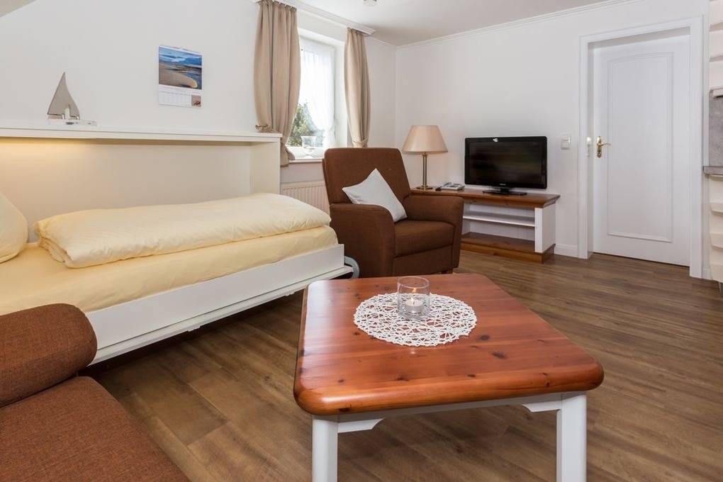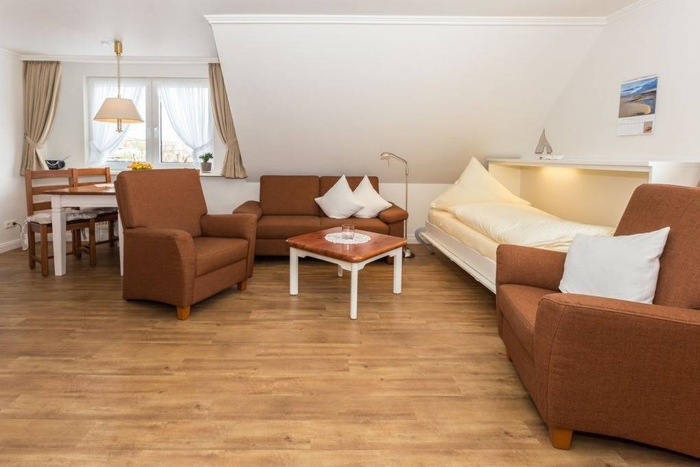 Die geräumige 2-Zimmer-Ferienwohnung für 2-3 Personen, ca. 45m², besteht aus einem separaten Schlafzimmer mit Doppelbett, Duschbad / WC, Wandklappbett im Wohnraum, Wohnzimmer mit Essplatz sowie Sitzgruppe, Flat-TV, Radio, Telefon und kostenfreiem W-Lan. Die Küchenzeile ist zum Wohnraum offen mit Geschirrspüler und Mikrowelle ausgestattet. Waschmaschine sowie Trockner sind gemeinschaftlich auf der gleichen Ebene im Obergeschoß nutzbar. Ein Pkw-Stellplatz befindet sich vor dem Haus. Der gemeinschaftliche Außenbereich bietet einen Terrassenplatz mit Strandkorb und Gartenmöbeln, einen überdachten Sitzbereich, einen großzügigen Fahrradunterstand sowie Schränke für Ihre Golfbags. Tierhaltung ist nicht gestattet. Bettwäsche und Handtücher sind zur Anreise aufgezogen.
