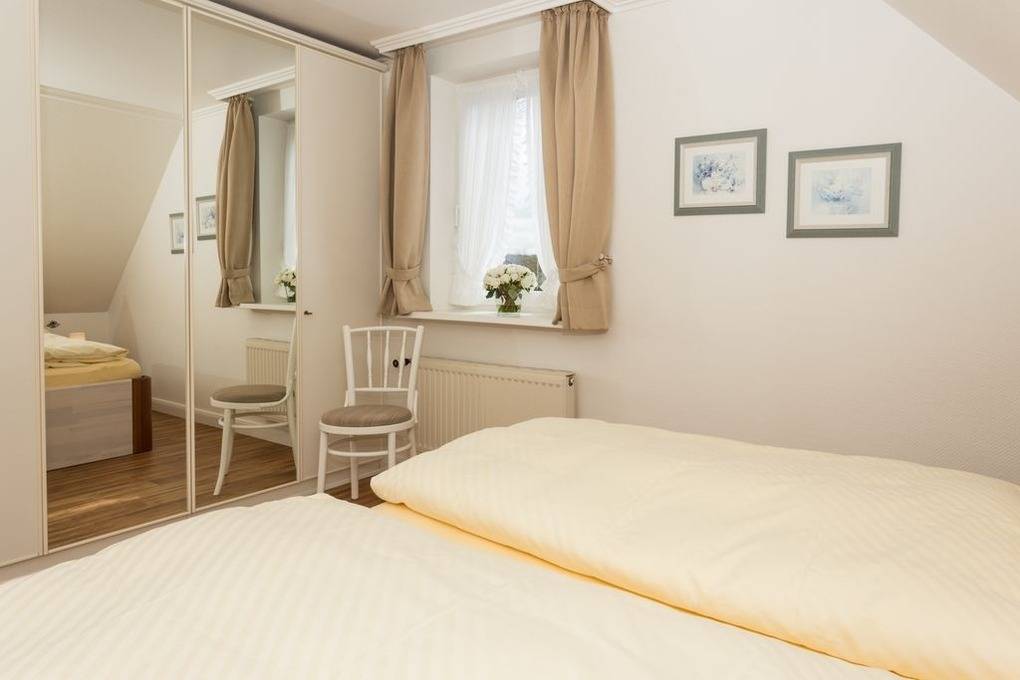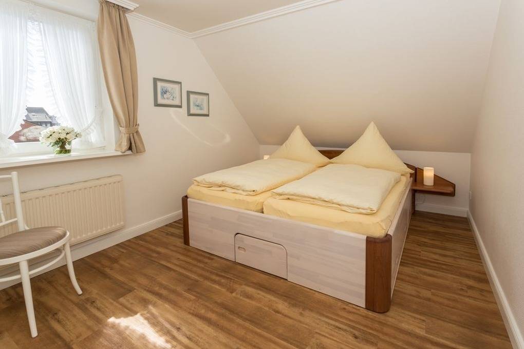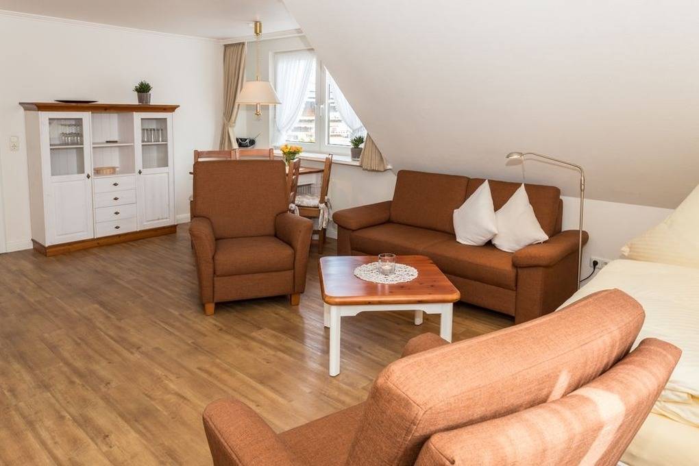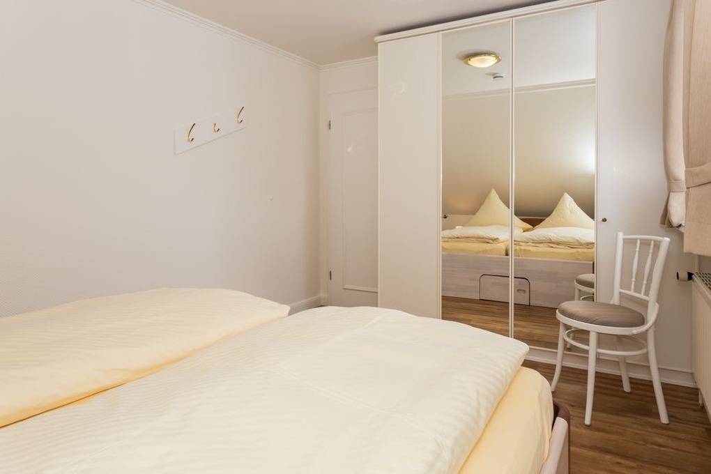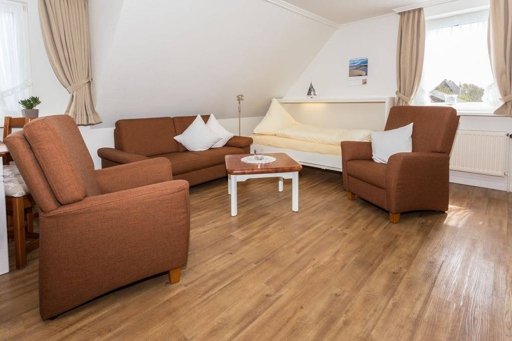 Die geräumige 2-Zimmer-Ferienwohnung für 2-3 Personen, ca. 45m², besteht aus einem separaten Schlafzimmer mit Doppelbett, Duschbad / WC, Wandklappbett im Wohnraum, Wohnzimmer mit Essplatz sowie Sitzgruppe, Flat-TV, Radio, Telefon und kostenfreiem W-Lan. Die Küchenzeile ist zum Wohnraum offen mit Geschirrspüler und Mikrowelle ausgestattet. Waschmaschine sowie Trockner sind gemeinschaftlich auf der gleichen Ebene im Obergeschoß nutzbar. Ein Pkw-Stellplatz befindet sich vor dem Haus. Der gemeinschaftliche Außenbereich bietet einen Terrassenplatz mit Strandkorb und Gartenmöbeln, einen überdachten Sitzbereich, einen großzügigen Fahrradunterstand sowie Schränke für Ihre Golfbags. Tierhaltung ist nicht gestattet. Bettwäsche und Handtücher sind zur Anreise aufgezogen.