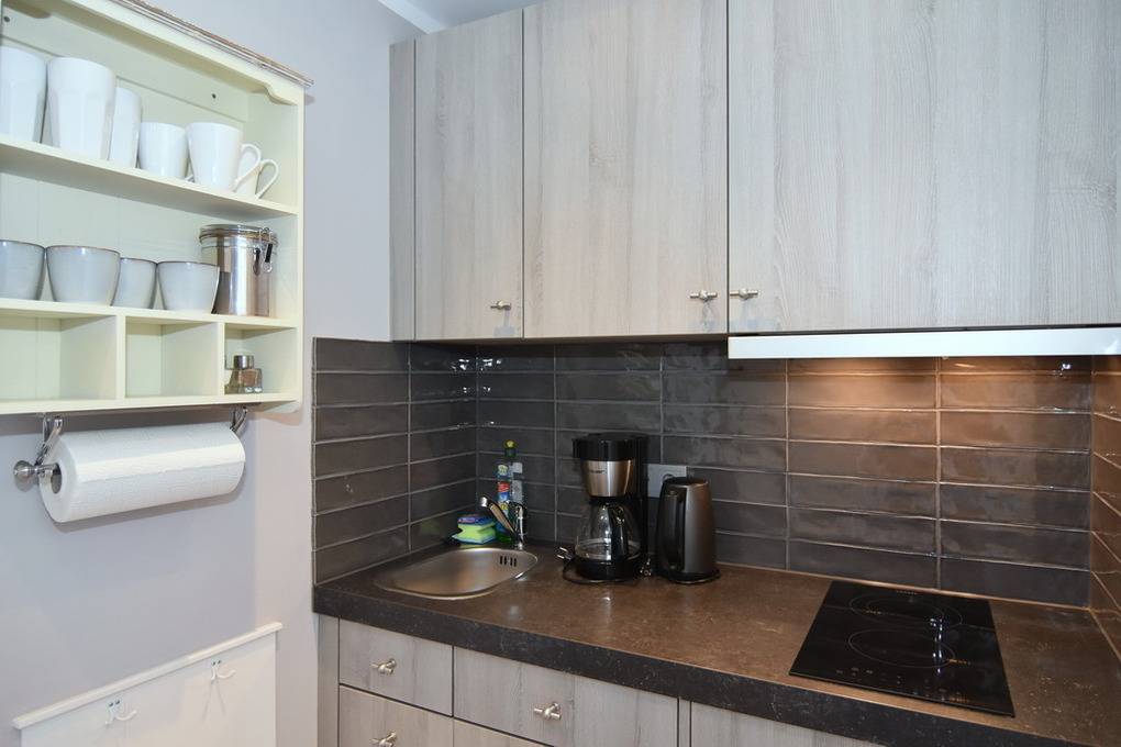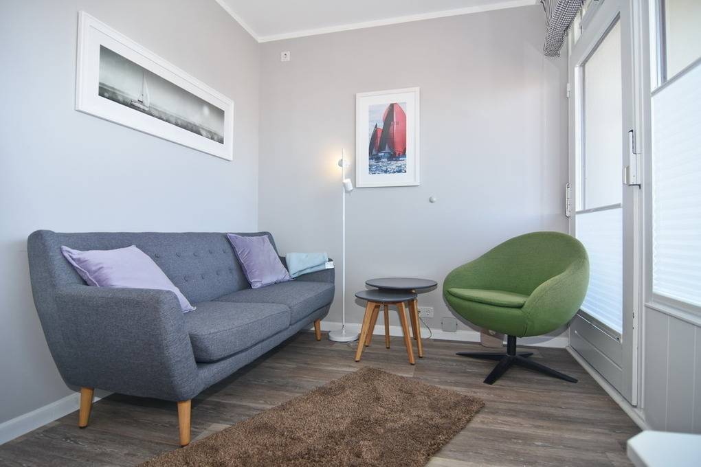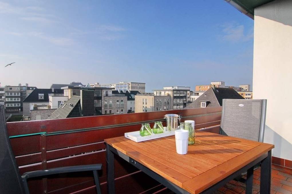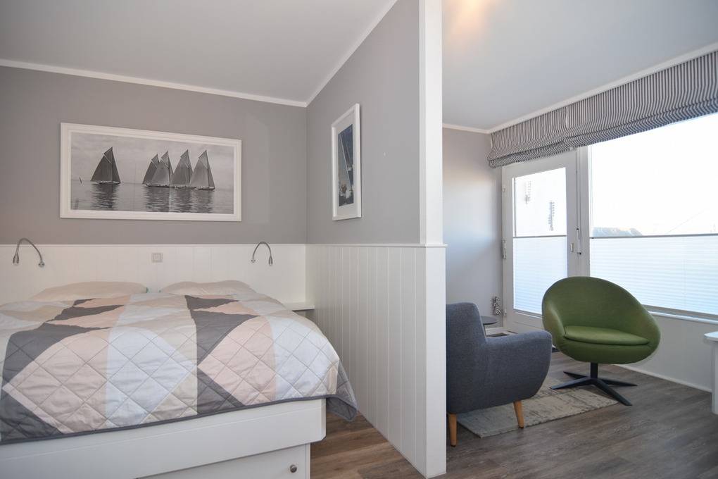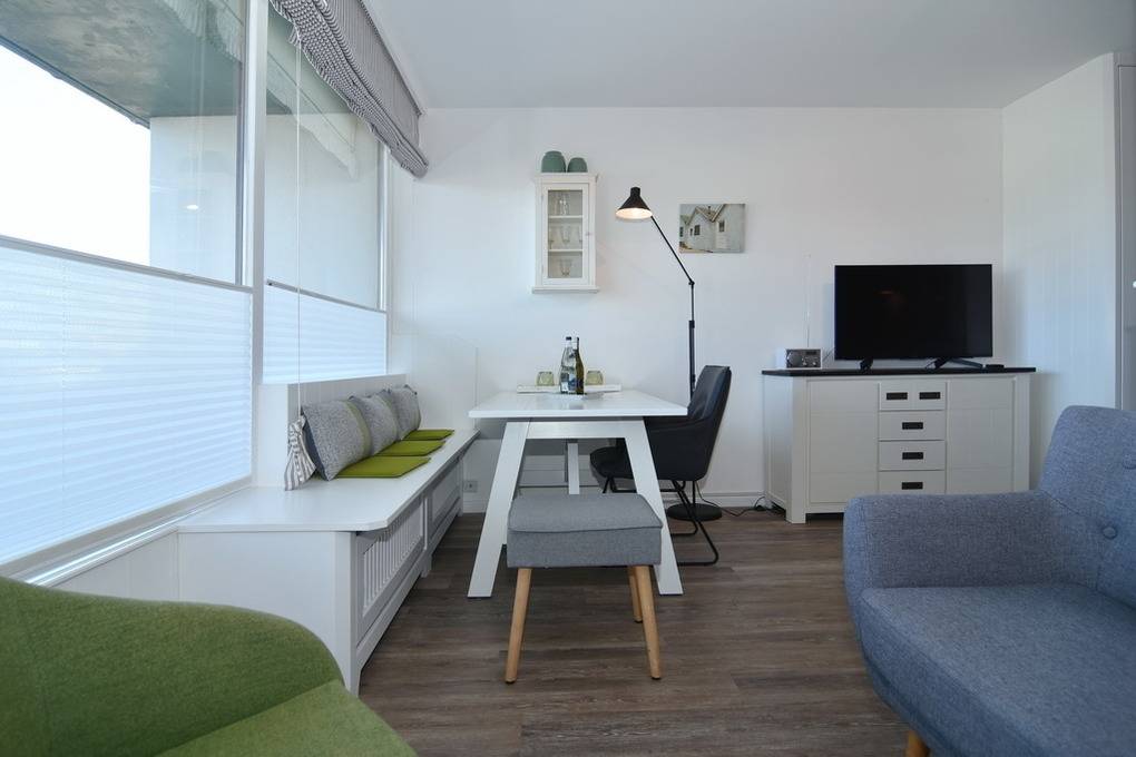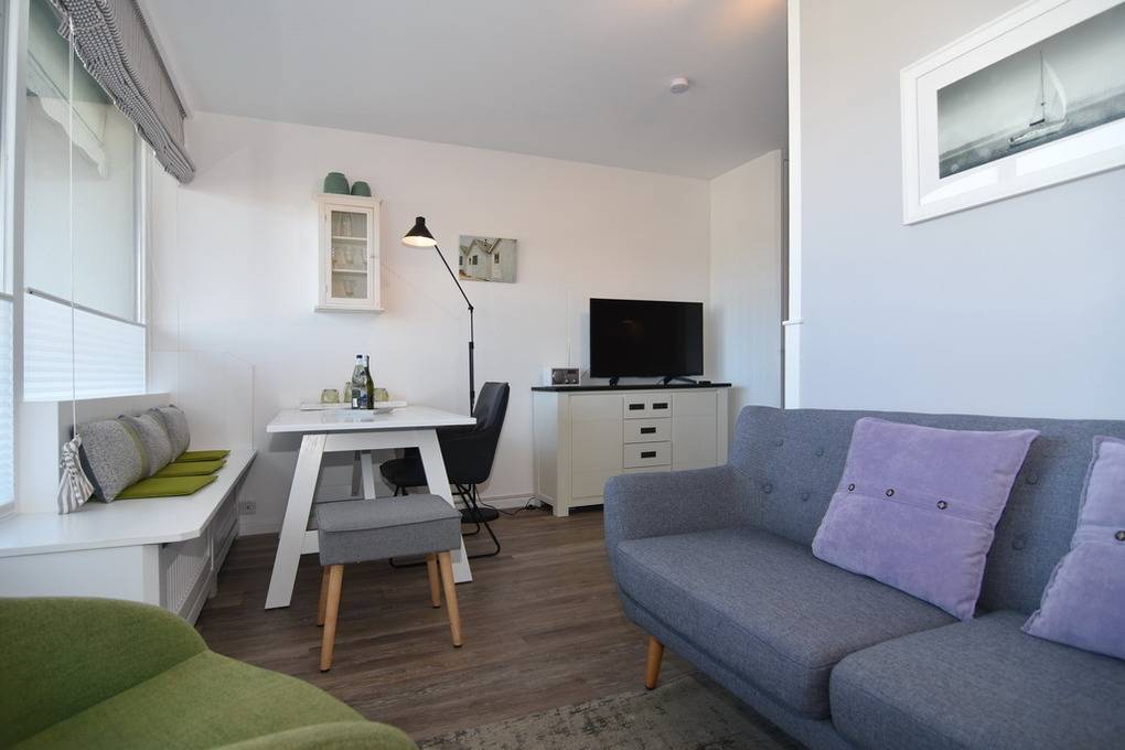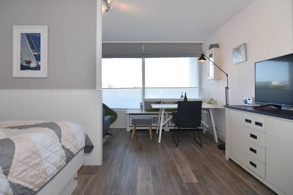 Moderne und frisch renovierte 1-Zimmer-Wohnung für 2 Personen im Herzen von Westerland. Der kombinierte Wohn-/ Schlafraum verfügt über ein großes Doppelbett, gemütlicher Sitzecke und einem Essbereich. Vom Bett und Essplatz aus können Sie TV schauen, vom Sofa und Essplatz können Sie aus den großen Panorama-Fenster auf den Westbalkon und Richtung Stadt schauen. Eine kleine Küche im Eingangsbereich mit Kühlschrank und Ceranherd bietet Ihnen Platz für die Zubereitung kleiner oder großer Gerichte. Zur Wohnung gehört ein eigener Pkw-Stellplatz (Nr. 47), Ihre Fahrräder können hinterm Haus abgestellt werden. Eine gebührenpflichtige Waschküche befindet sich im Haus. Achtung: Der Fahrstuhl im Haus hält zwischen den Etagen, so dass Sie ca. 10 Stufen gehen müssen. Bettwäsche und Handtücher sind zur Anreise aufgezogen. Auf dem nördlich angrenzenden Nachbargrundstück entsteht ab Mai 2024 ein Neubauvorhaben. Hier kann es zu Lärmbelästigung kommen.
