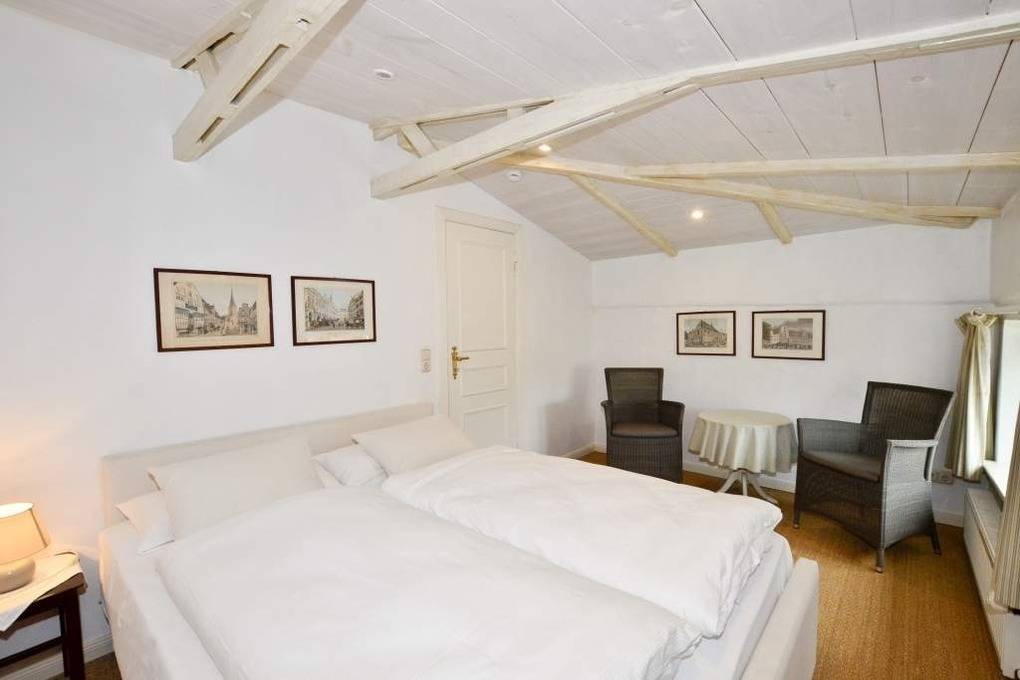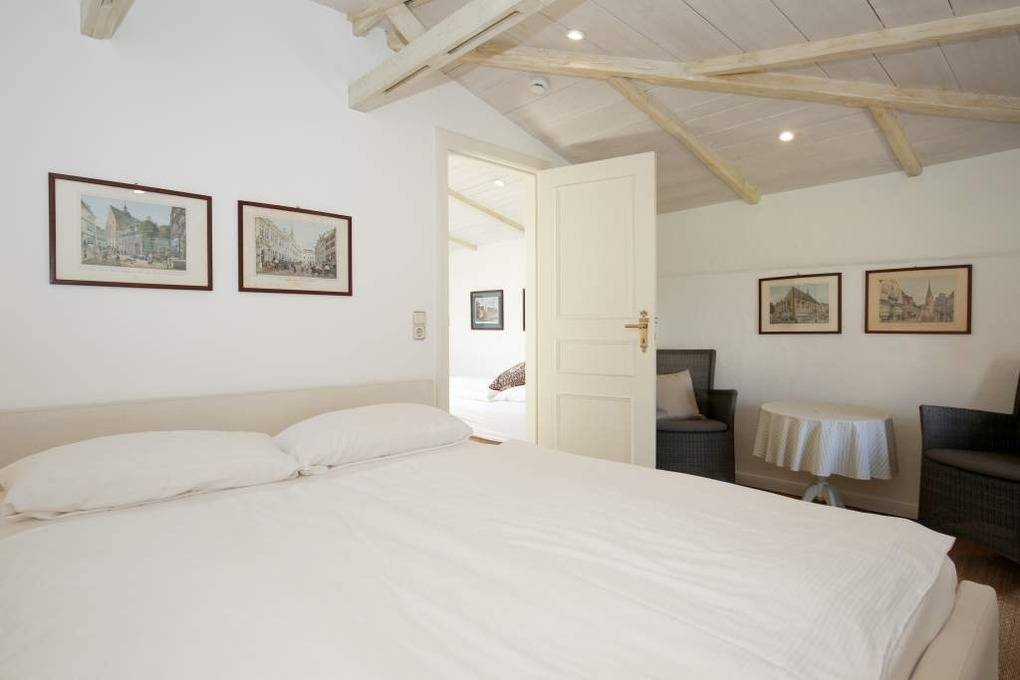 Dahinter liegt das separate Schlafzimmer mit Doppelbett (Einzelmatratzen 0,80 x 2,00 m mit durchgehendem Topper), Kleiderschrank und zwei Sessel.
