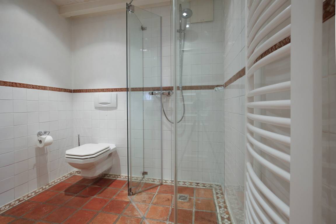 Im Bad befinden sich eine Dusche, ein WC und ein Waschbecken.