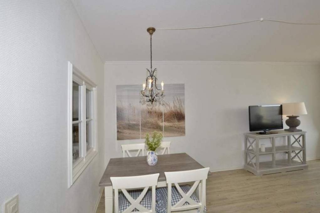 Vom Vorflur mit Garderobe gelangen Sie direkt in das helle Wohnzimmer mit Zugang zum Balkon, in die separate Küche sowie in das praktische Gäste-WC. Der Wohnbereich ist mit einem Designerboden in Holzoptik, einer Sitzgarnitur (2-Sitzer-Doppelschlafcouch mit Liegehöhe, ca. 1,45 x 1,95 m, und Sessel), einem Essplatz sowie einem großen Kabel-Flachbild-TV mit 4K-TV Stick mit Online-Streamingdienst-Zugang (ohne Konto), inklusive Fernbedienung und Sprachsteuerung und einem Radio ausgestattet.