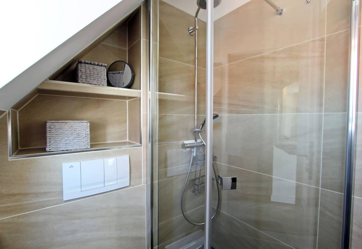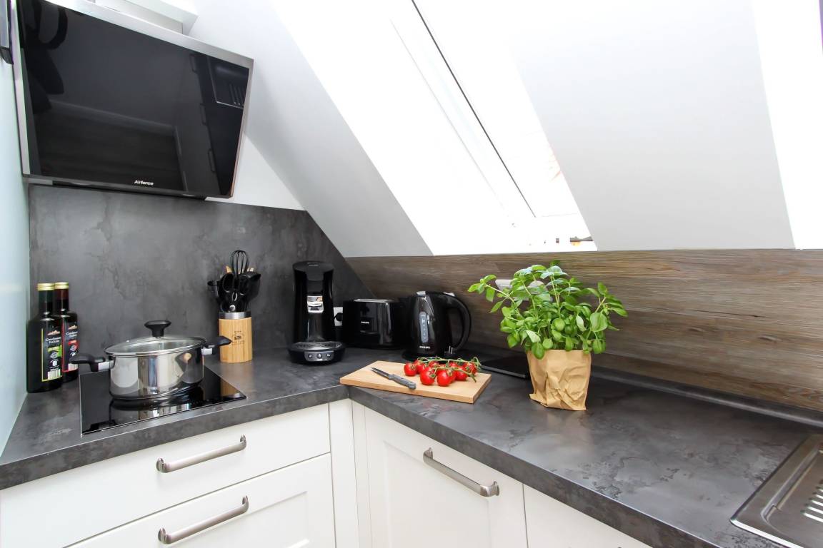 Küchenausstattung: zweier Induktionskochfeld, sowie eine weitere zweier Induktionskochplatte, Backofen mit Mikrowelle, entsprechendes Koch- Back- und Mikrowellenzubehör, Senseopad-und Kaffeemaschine, Handmixer, Pürierstab, Toaster, Raclette, Waffeleisen und Wasserkocher, Spülmaschine und Kühlschrank mit Gefrierfach.
