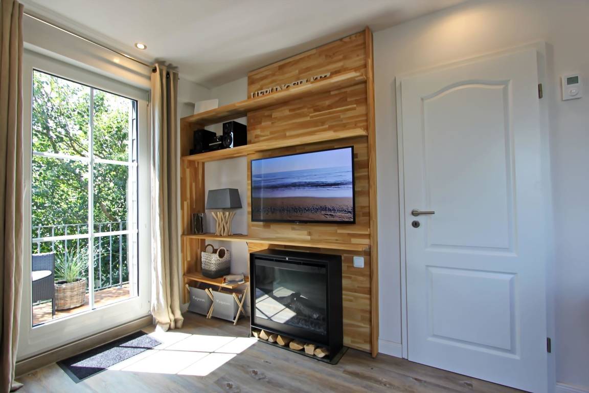 Falls das Wetter mal rau und stürmisch ist, kann man es sich vor dem Flammenspiel des elektrischen Kaminofens besonders gemütlich machen.