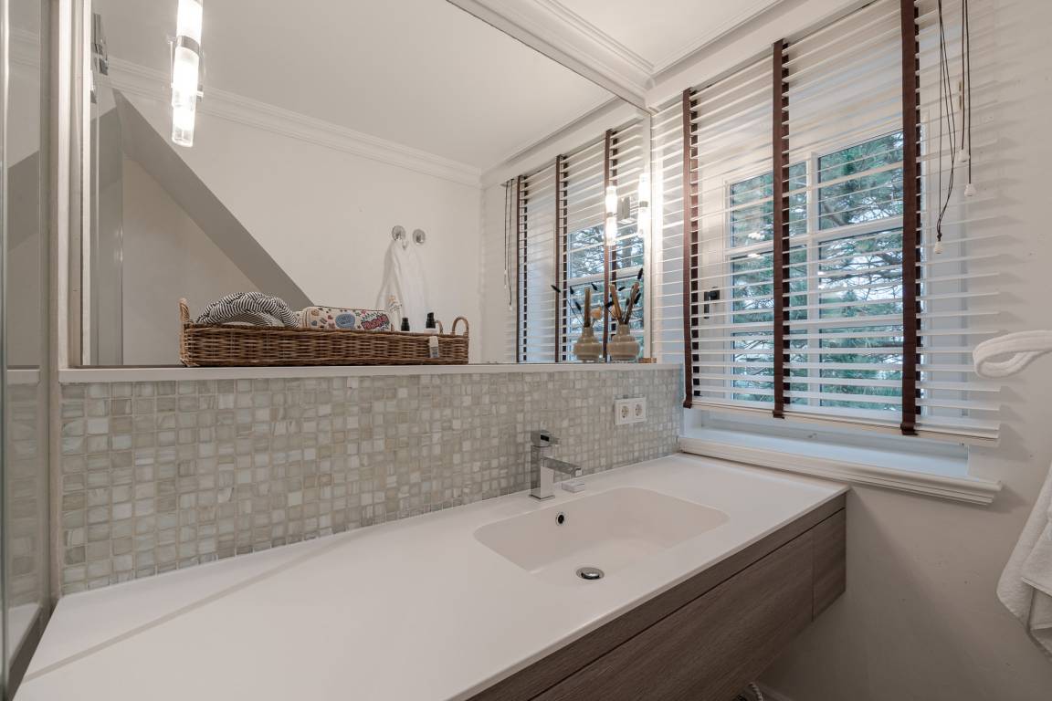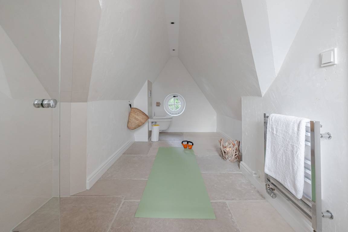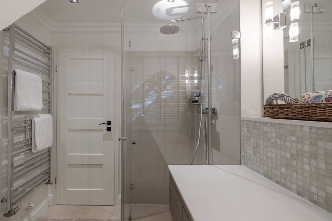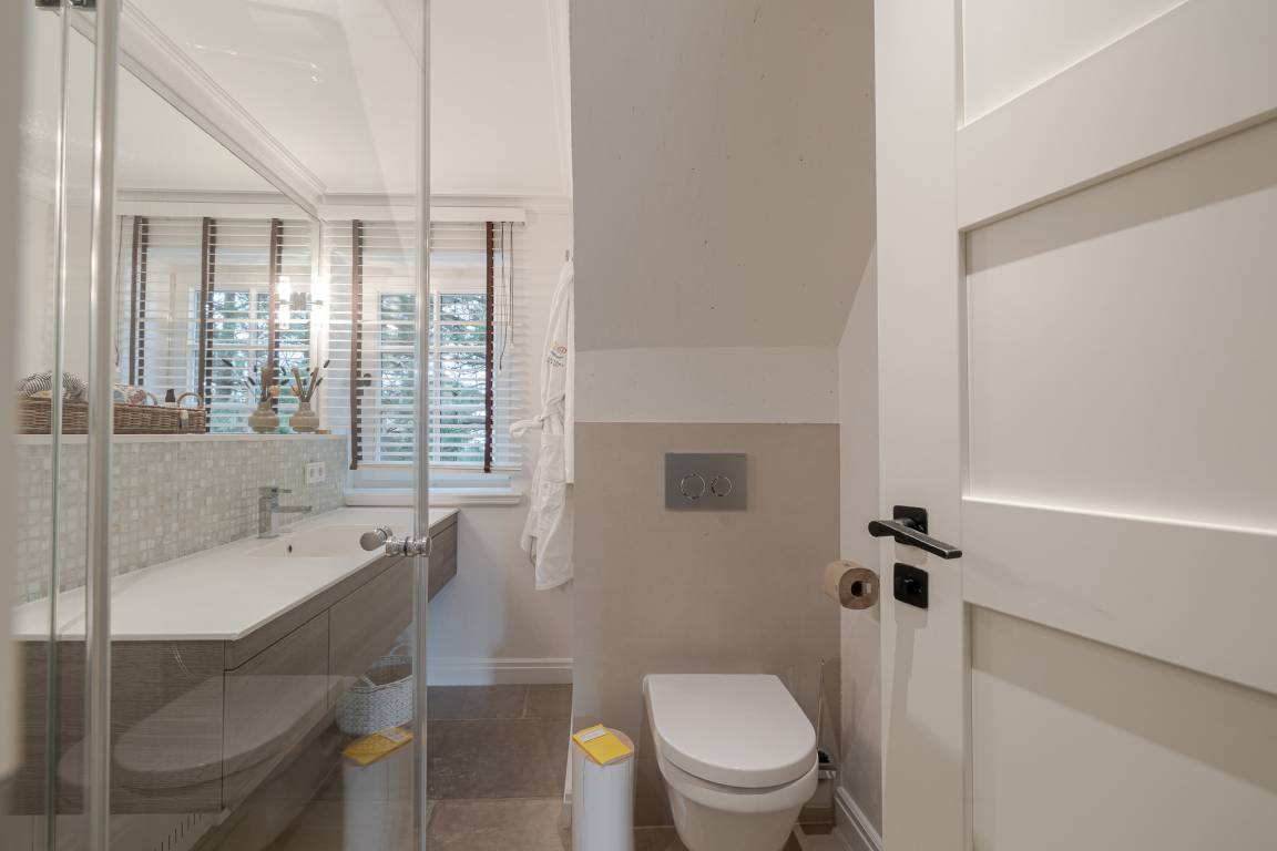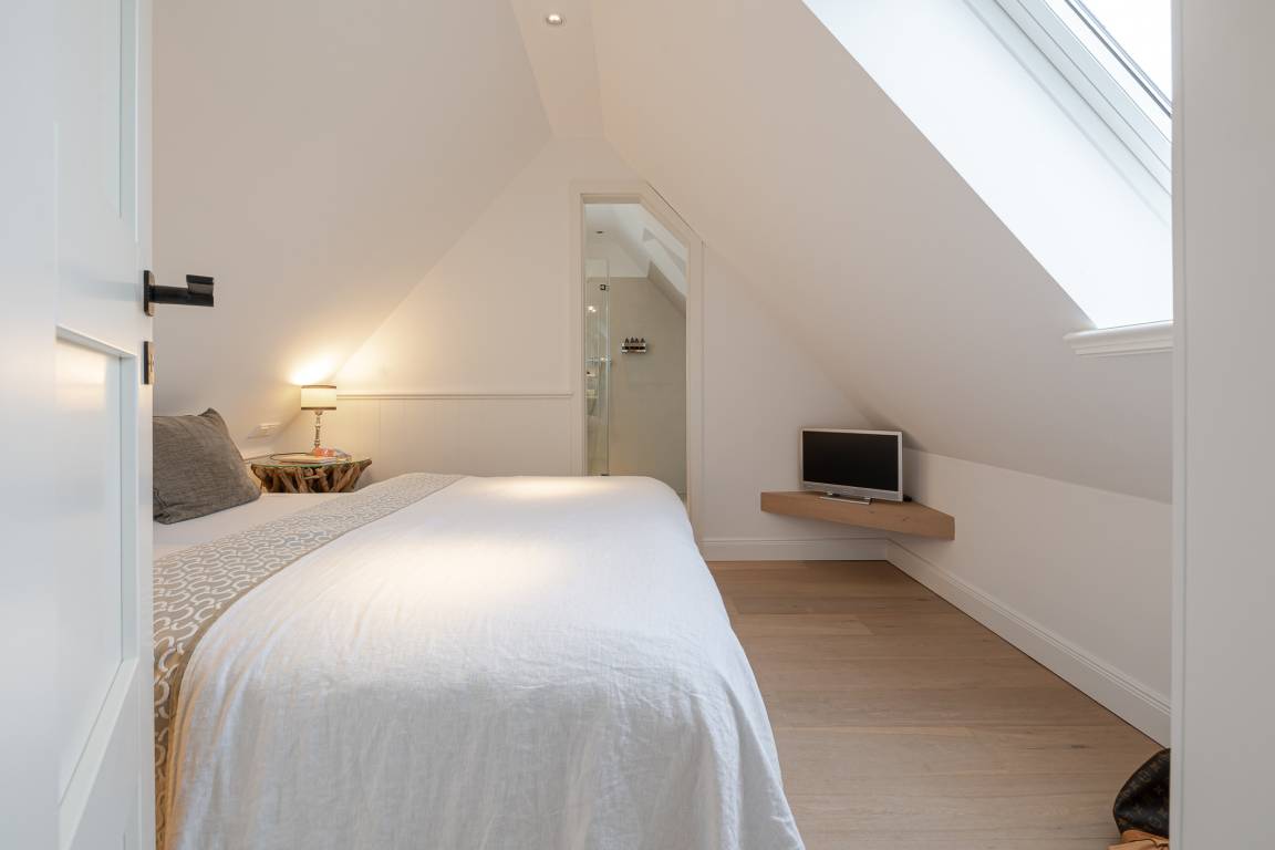 Das Schlafzimmer verfügt über ein komfortables Boxspringbett und ausreichend Stauraum. Das moderne Badezimmer ist mit Dusche, WC und Handtuchheizkörper ausgestattet.