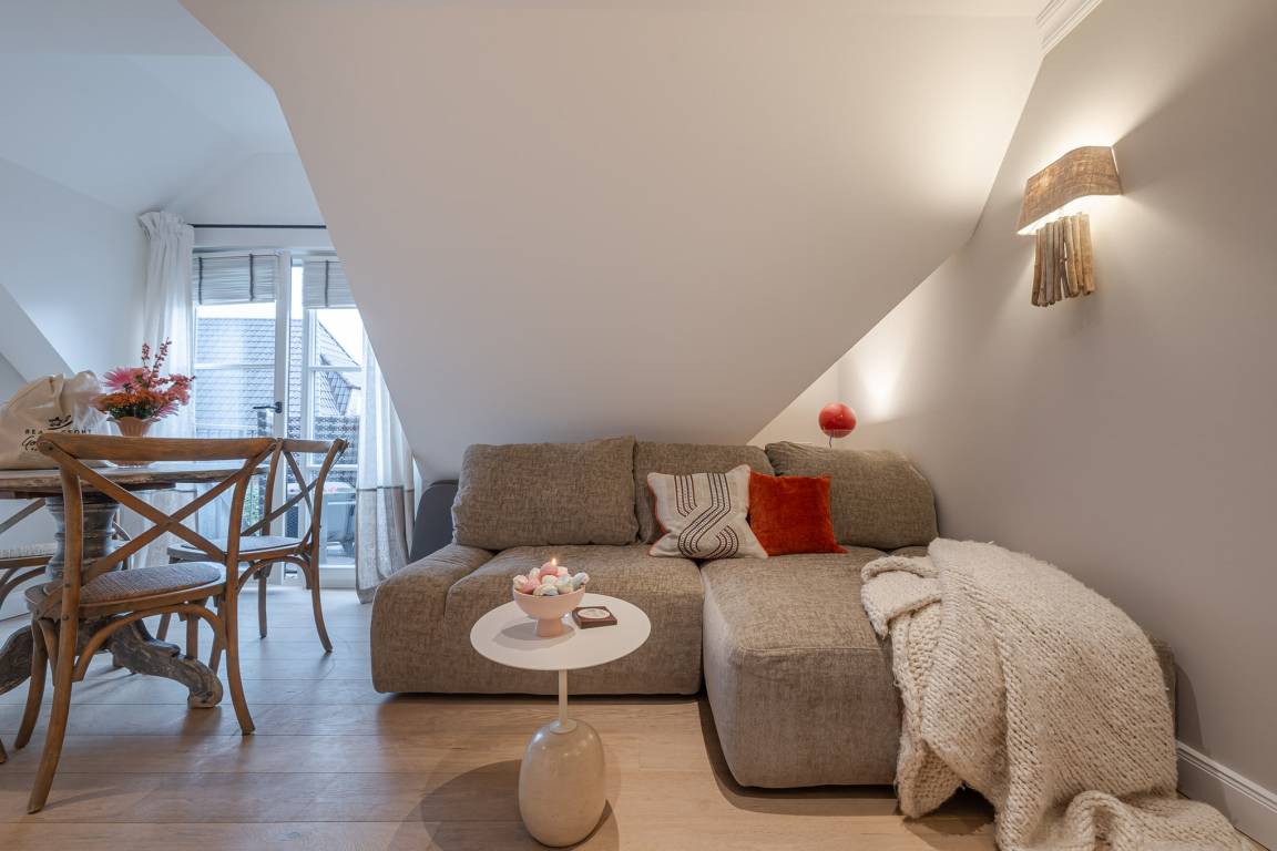 Der lichtdurchflutete Wohnbereich ist hochwertig eingerichtet mit eleganten Freifrau-Esszimmerstühlen und einer komfortablen Couch, die bei Bedarf als Schlafsofa genutzt werden kann – ideal für entspannte Stunden nach einem Strandtag.