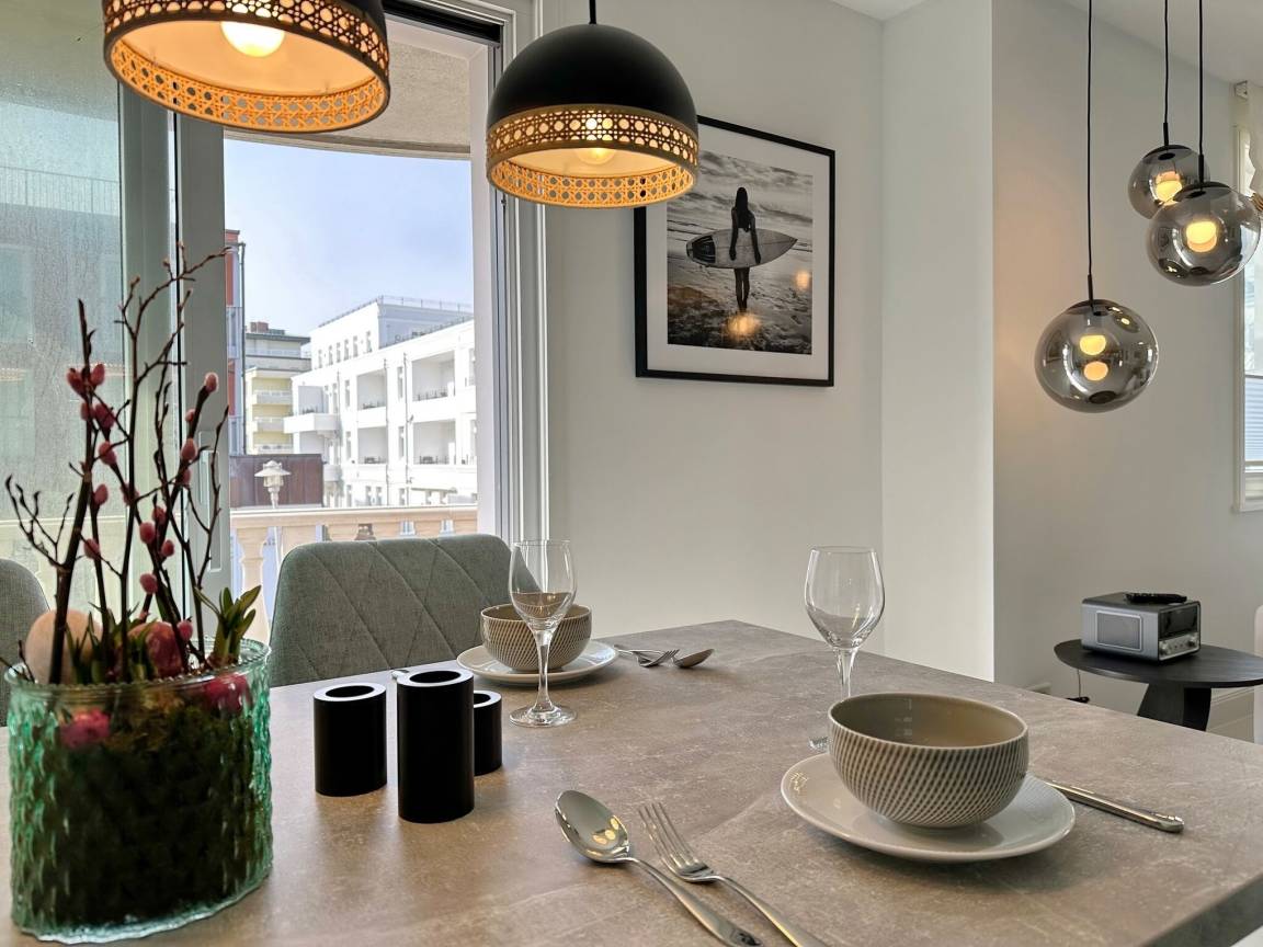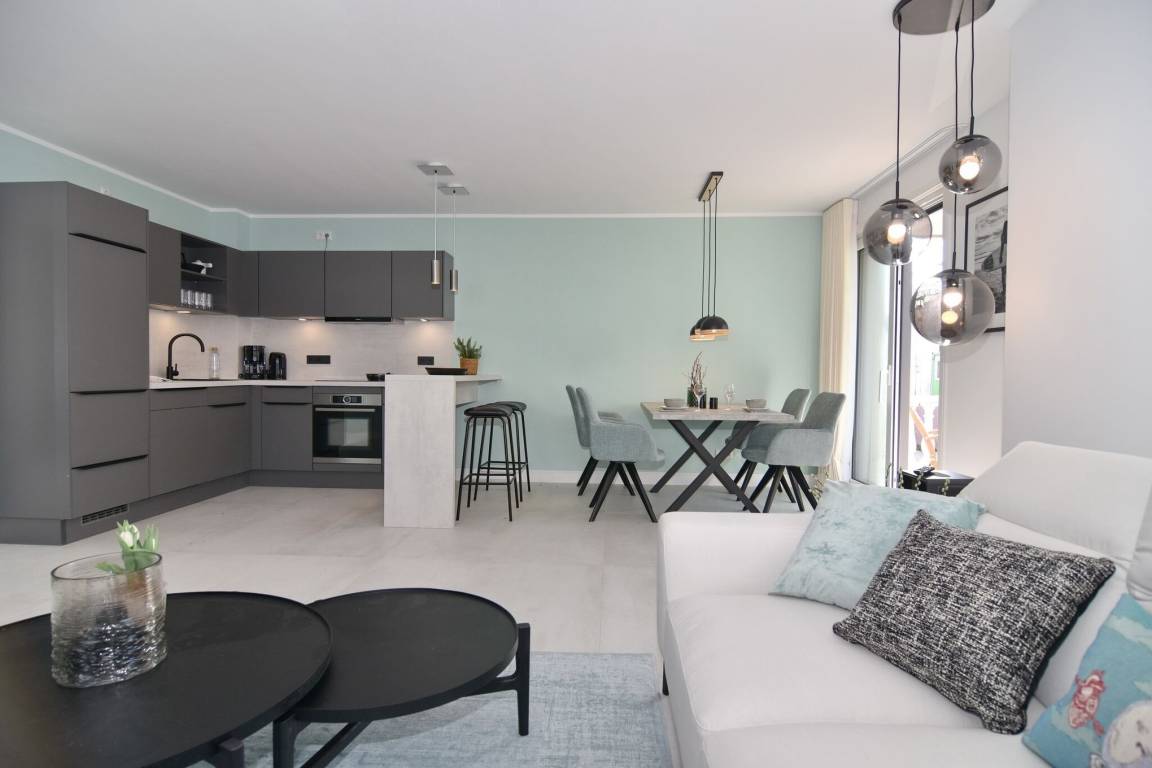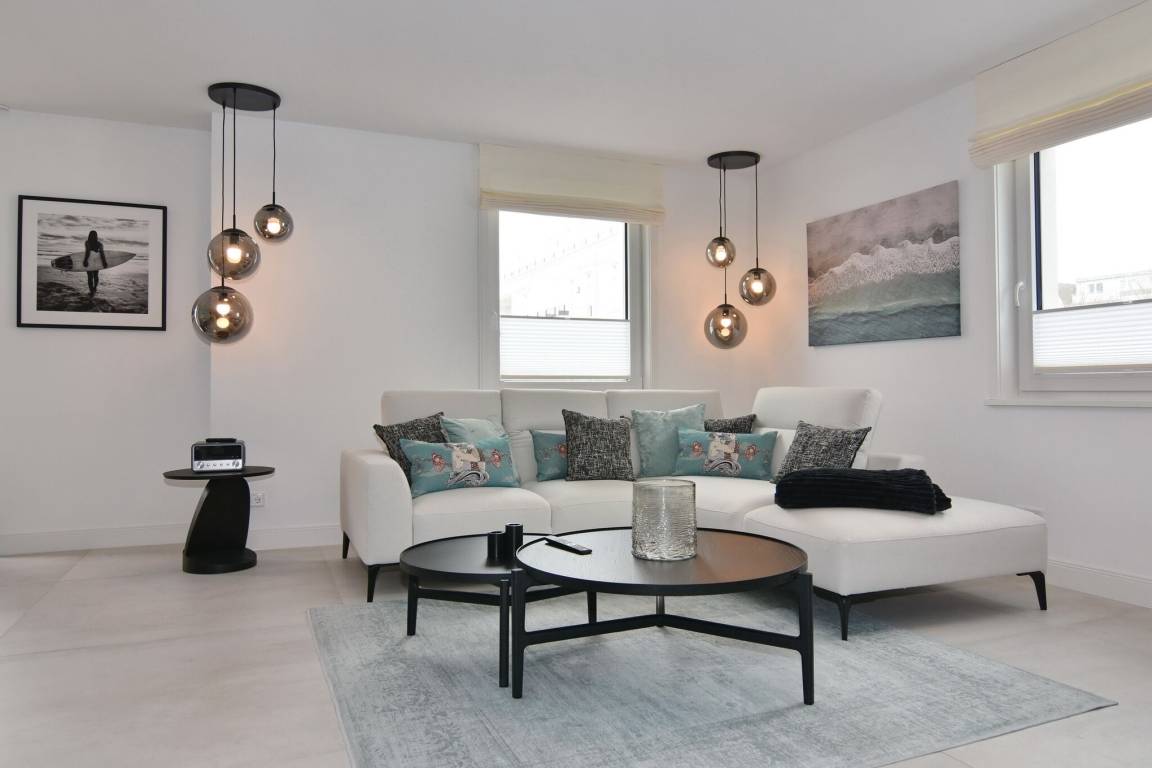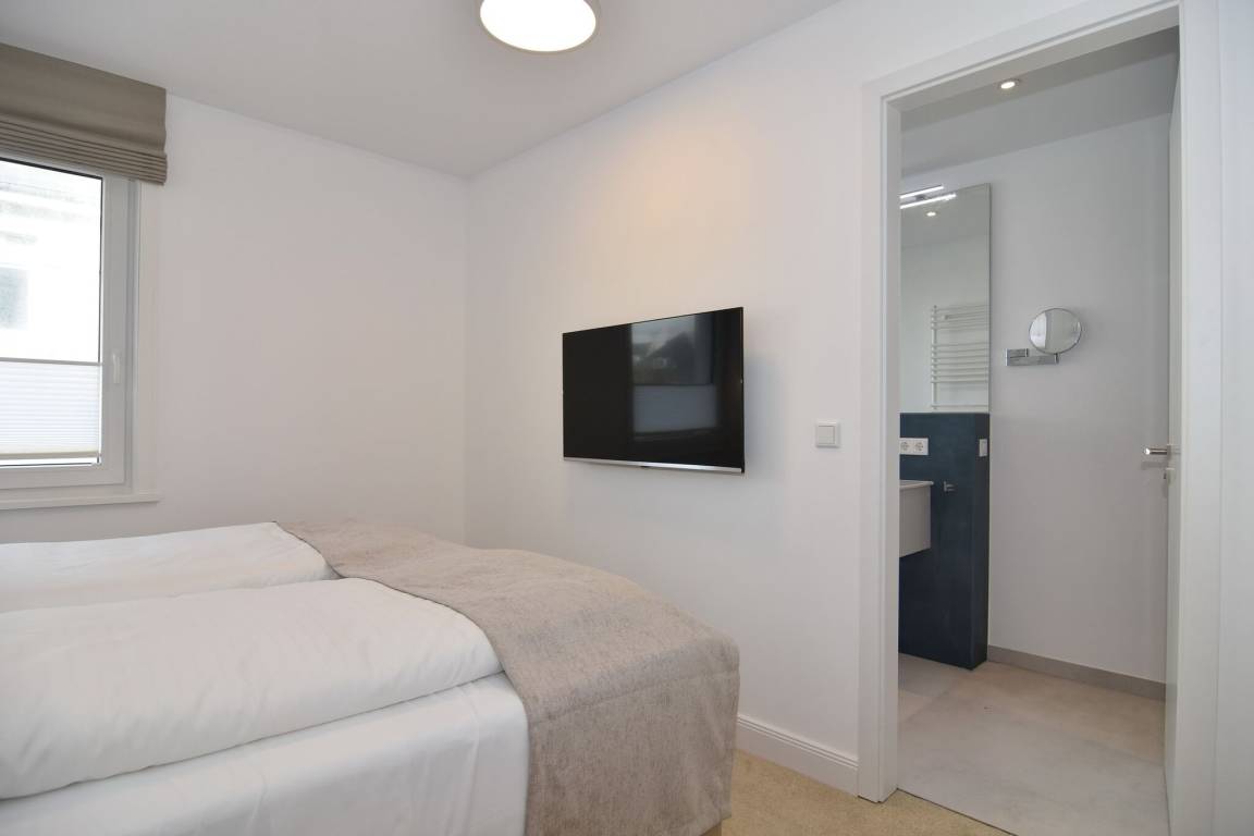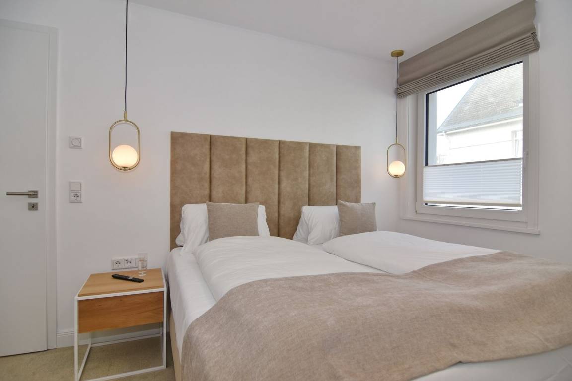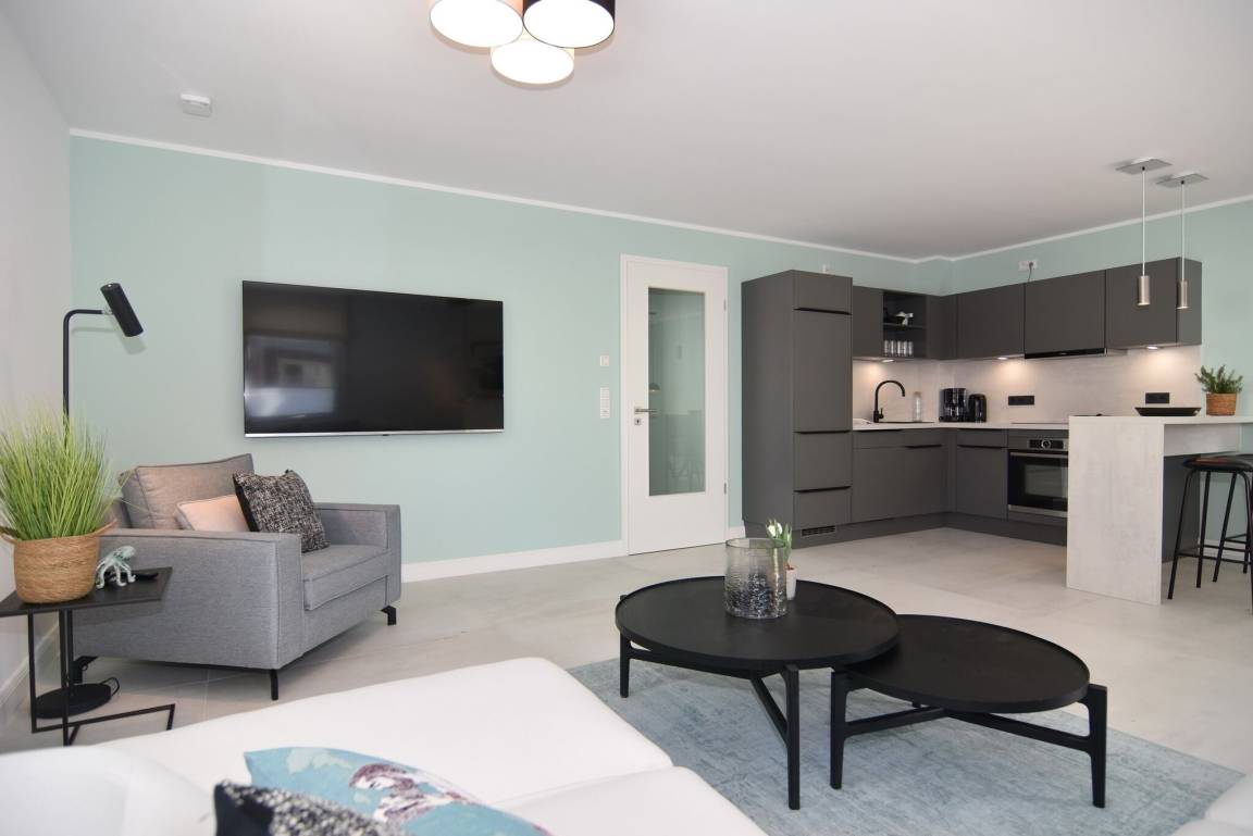 Die hochwertige 3-Zimmer-Wohnung im 1. OG mit ca. 80 qm ist für maximal 4 Personen. Vom geräumigen Flur mit Garderobe gelangen Sie in das Wohnzimmer mit offener Küche und möblierten Westbalkon. Die hochwertige Küche bietet neben Induktionsherd auch Geschirrspüler, Kühlschrank mit Gefrierfach und Backofen mit integrierter Mikrowelle. Beide Schlafräume bieten mit Boxspringbetten (180x200) der Marke FBF hochwertigen Schlafkomfort und verfügen über Einbauschrank und TV (1 Kinderbett im blauen Schlafzimmer zubuchbar). Die Wohnung verfügt über 2 moderne Duschbäder mit Haar- und Handtuchtrockner. Die Wohnung ist mit großformatigen Fliesen ausgelegt und verfügt über Fußbodenheizung. Lediglich die Schlafräume sind mit Teppichware versehen. Internet (ohne Gewähr) und Smart-TV sind vorhanden.