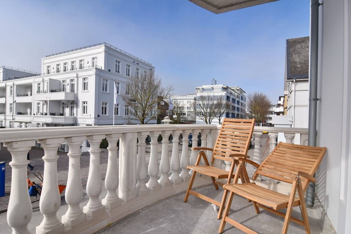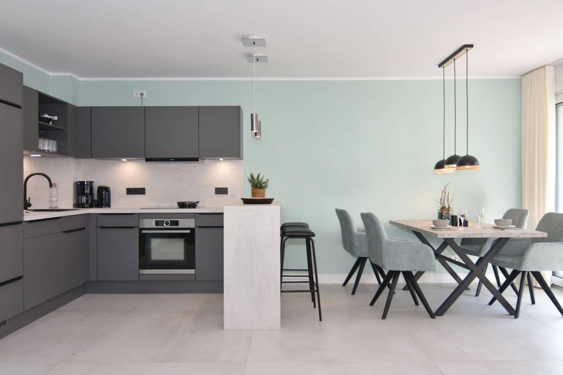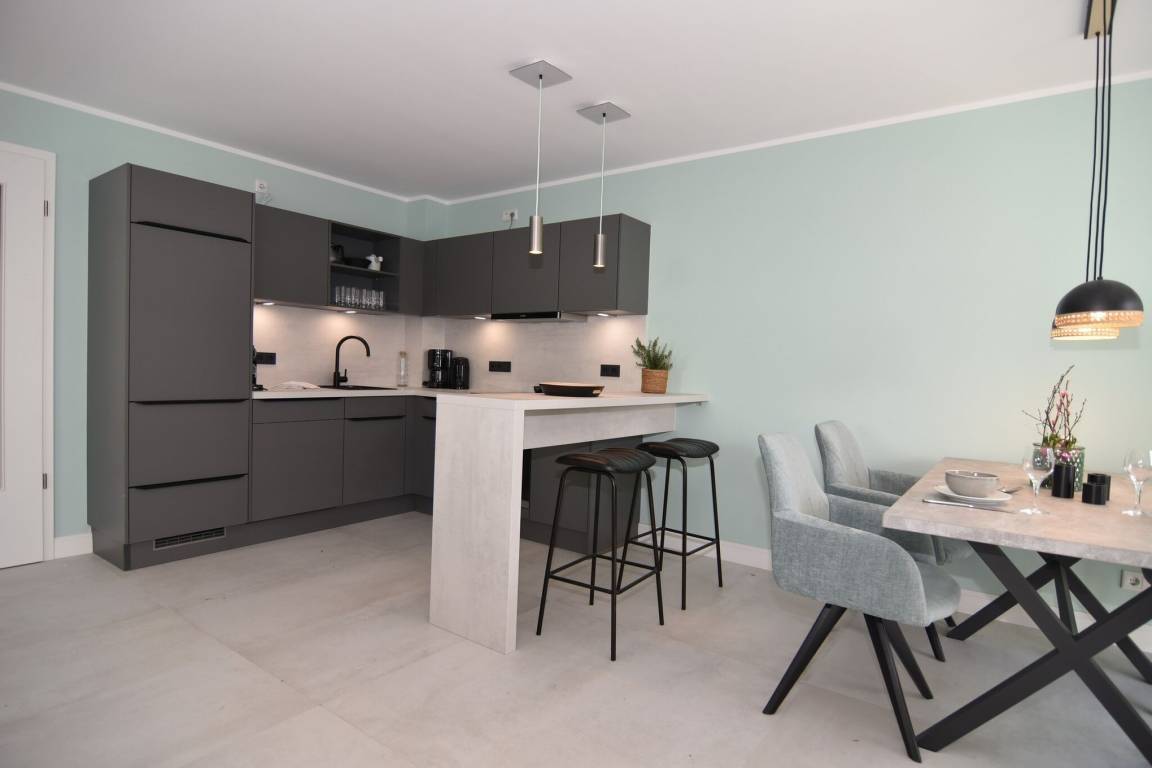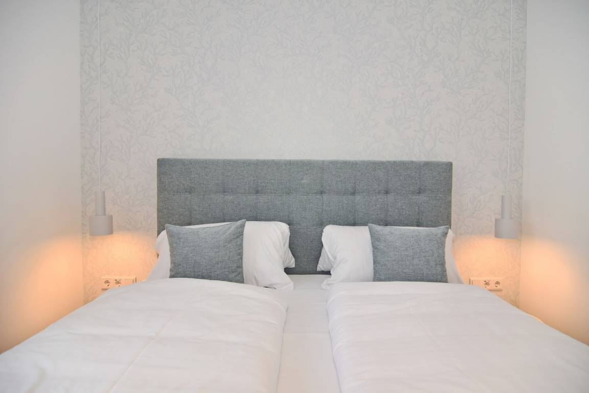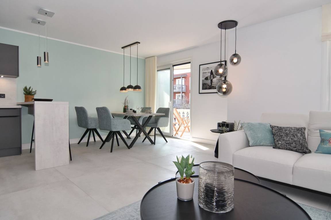 Die hochwertige 3-Zimmer-Wohnung im 1. OG mit ca. 80 qm ist für maximal 4 Personen. Vom geräumigen Flur mit Garderobe gelangen Sie in das Wohnzimmer mit offener Küche und möblierten Westbalkon. Die hochwertige Küche bietet neben Induktionsherd auch Geschirrspüler, Kühlschrank mit Gefrierfach und Backofen mit integrierter Mikrowelle. Beide Schlafräume bieten mit Boxspringbetten (180x200) der Marke FBF hochwertigen Schlafkomfort und verfügen über Einbauschrank und TV (1 Kinderbett im blauen Schlafzimmer zubuchbar). Die Wohnung verfügt über 2 moderne Duschbäder mit Haar- und Handtuchtrockner. Die Wohnung ist mit großformatigen Fliesen ausgelegt und verfügt über Fußbodenheizung. Lediglich die Schlafräume sind mit Teppichware versehen. Internet (ohne Gewähr) und Smart-TV sind vorhanden.