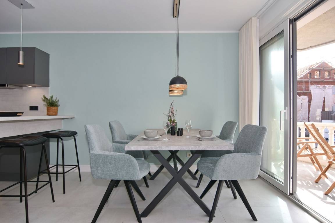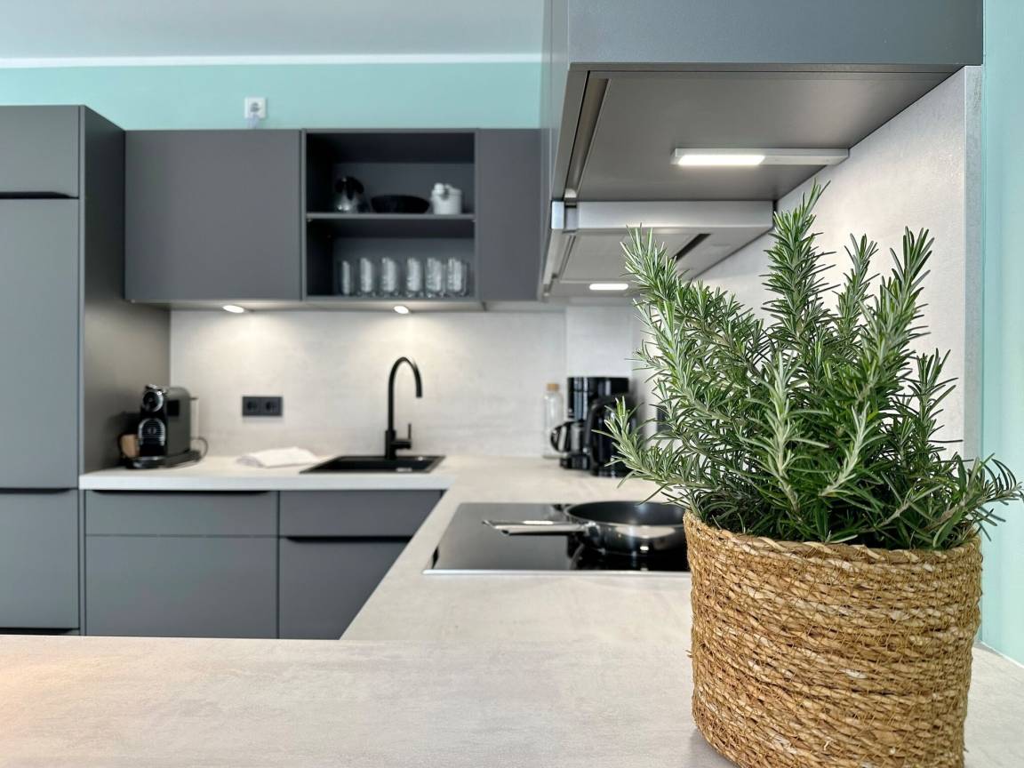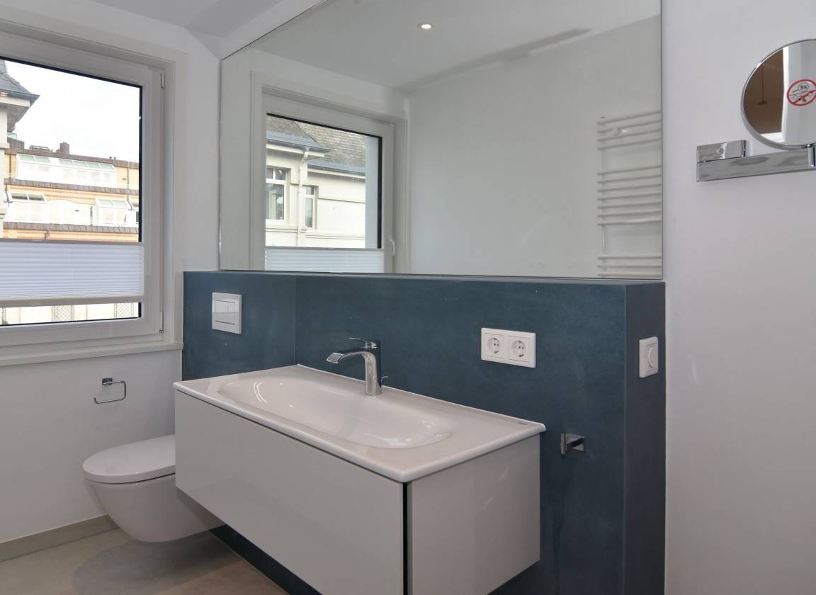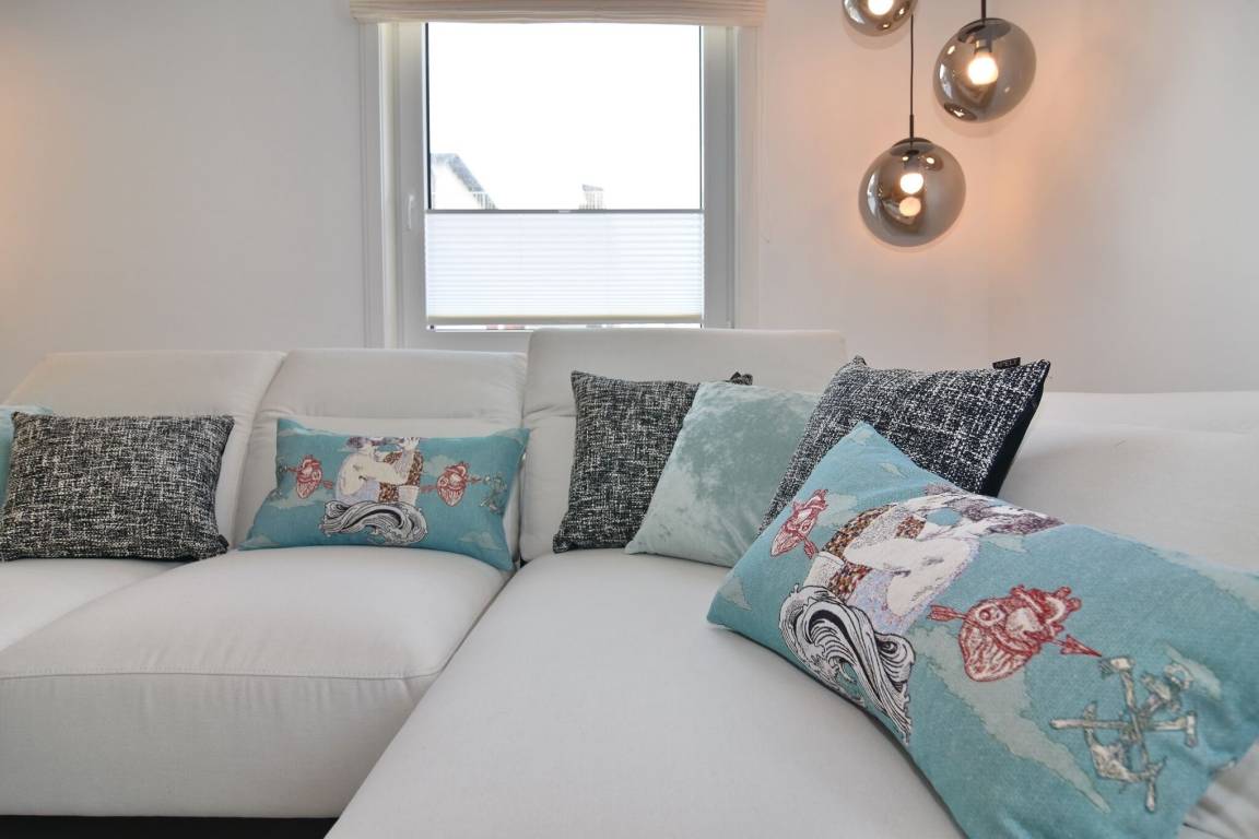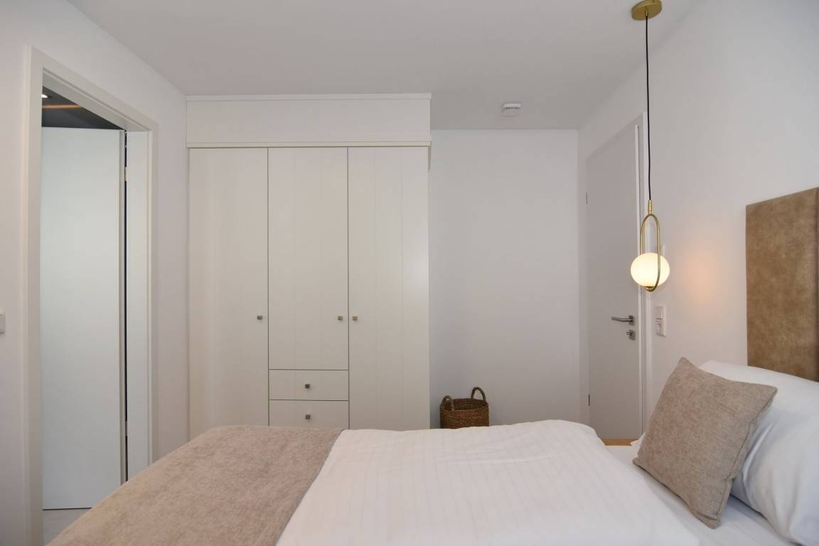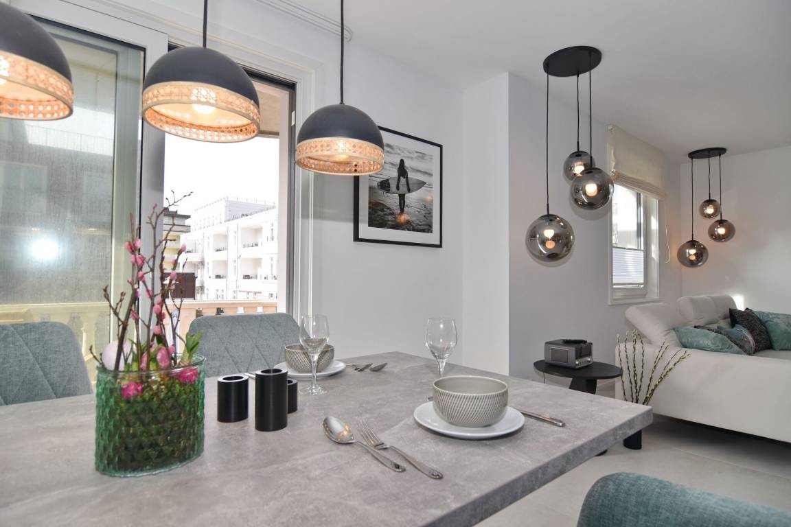 Die hochwertige 3-Zimmer-Wohnung im 1. OG mit ca. 80 qm ist für maximal 4 Personen. Vom geräumigen Flur mit Garderobe gelangen Sie in das Wohnzimmer mit offener Küche und möblierten Westbalkon. Die hochwertige Küche bietet neben Induktionsherd auch Geschirrspüler, Kühlschrank mit Gefrierfach und Backofen mit integrierter Mikrowelle. Beide Schlafräume bieten mit Boxspringbetten (180x200) der Marke FBF hochwertigen Schlafkomfort und verfügen über Einbauschrank und TV (1 Kinderbett im blauen Schlafzimmer zubuchbar). Die Wohnung verfügt über 2 moderne Duschbäder mit Haar- und Handtuchtrockner. Die Wohnung ist mit großformatigen Fliesen ausgelegt und verfügt über Fußbodenheizung. Lediglich die Schlafräume sind mit Teppichware versehen. Internet (ohne Gewähr) und Smart-TV sind vorhanden.
