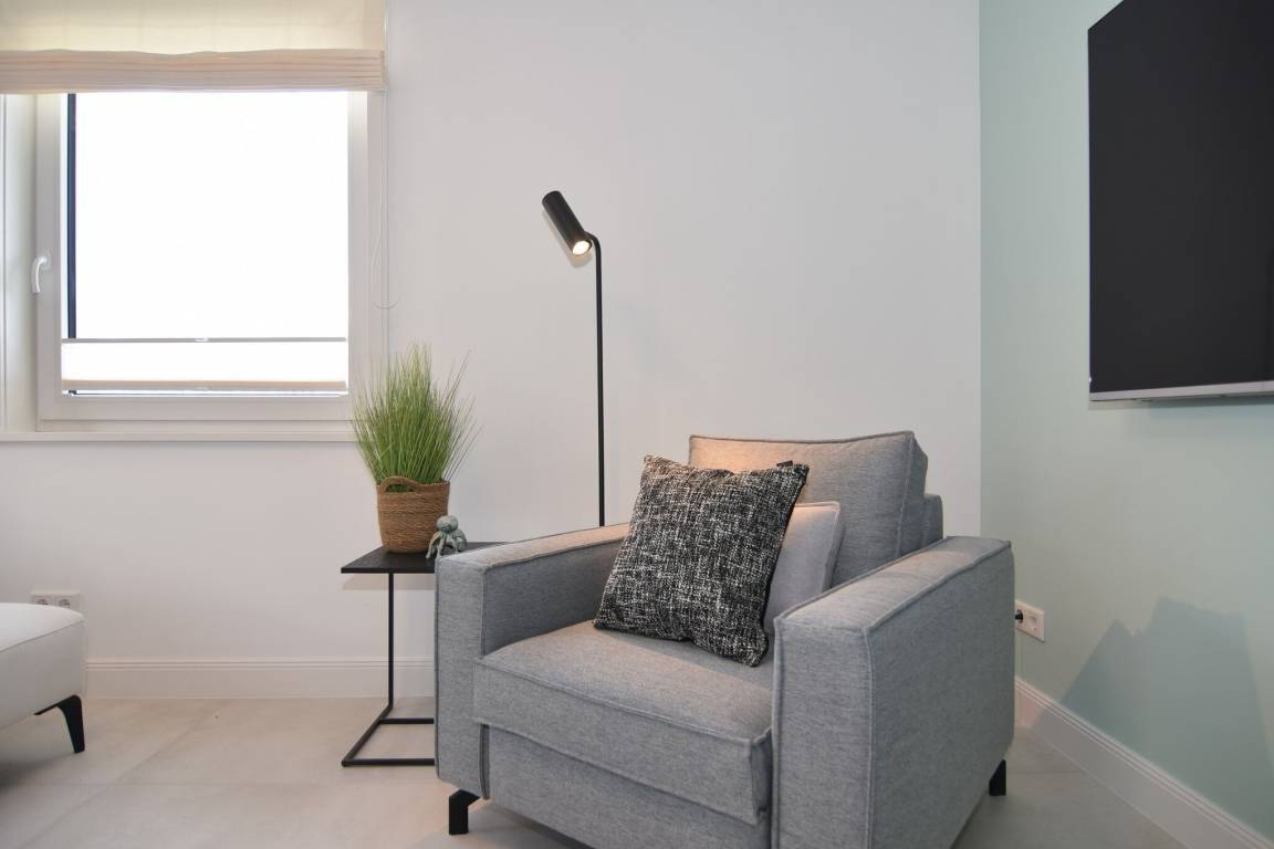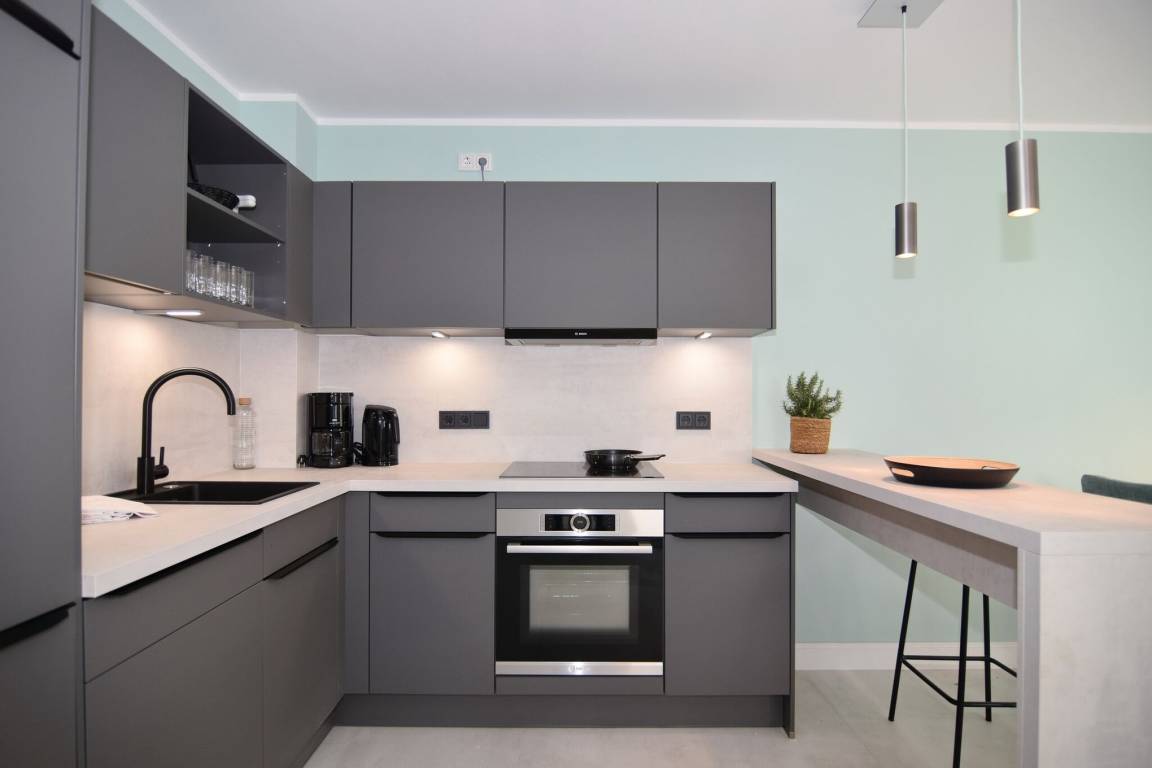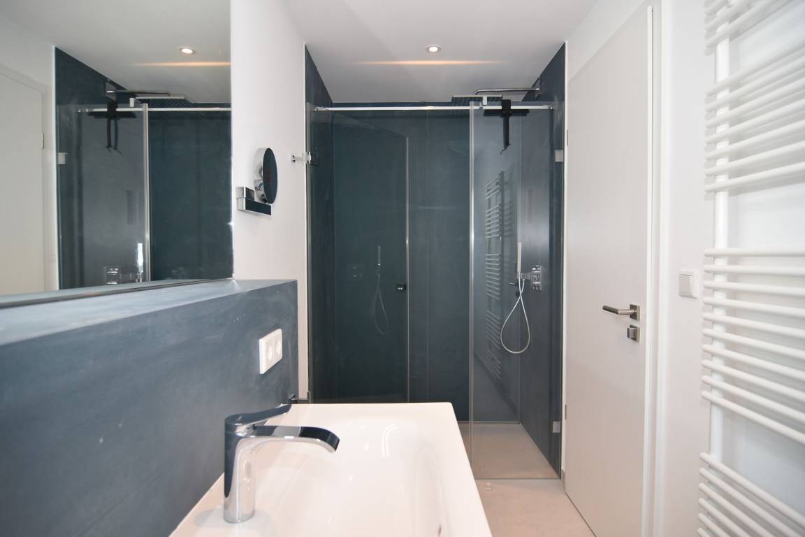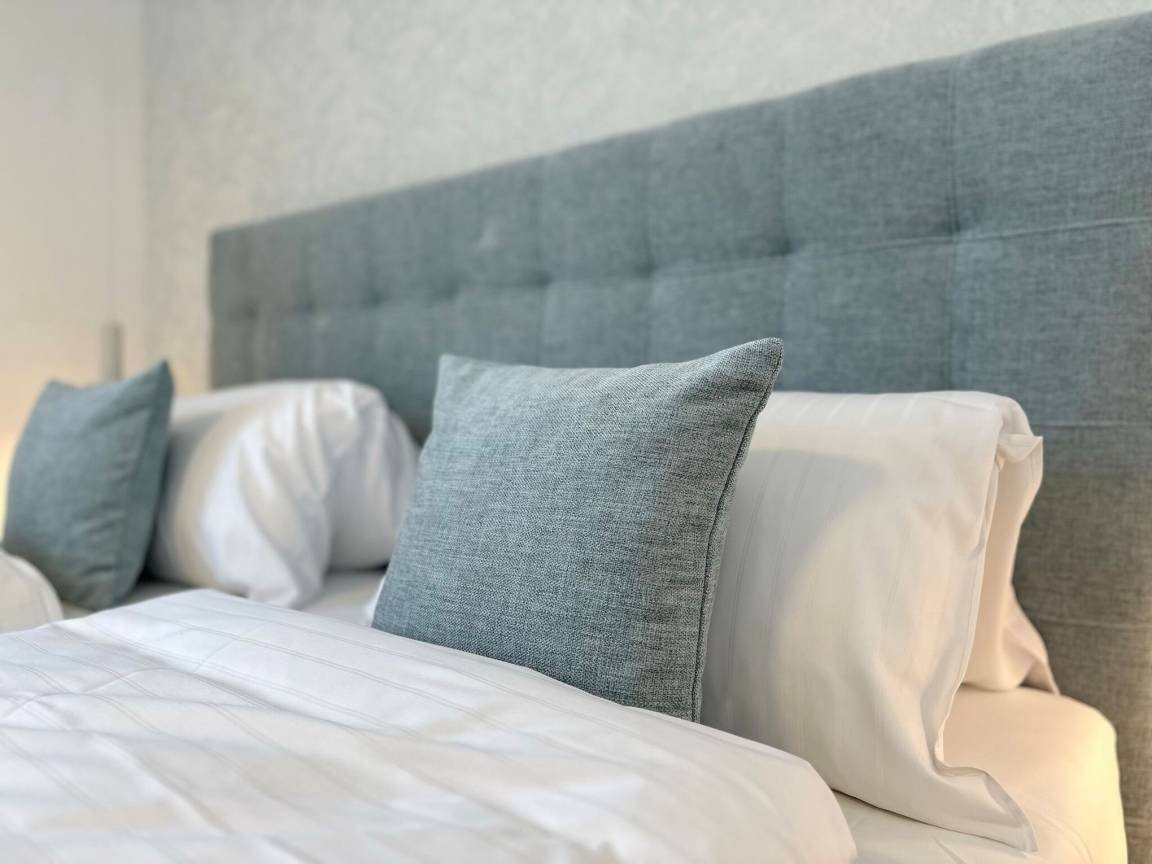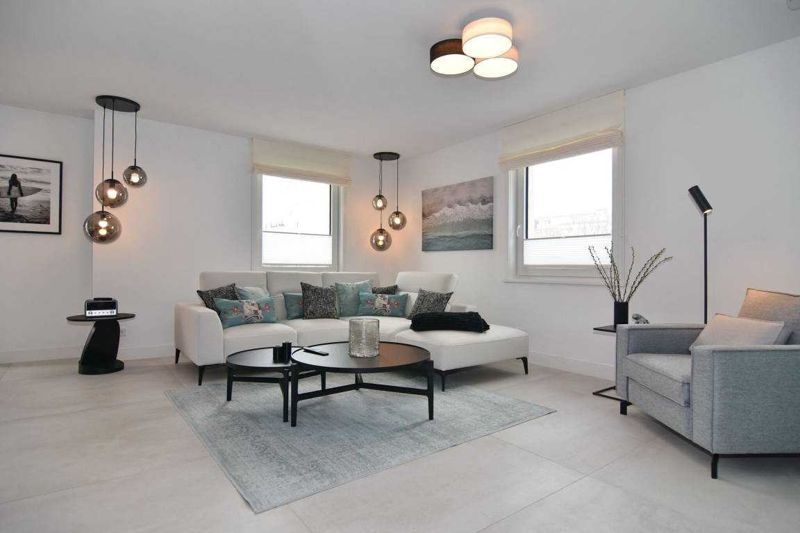 Die hochwertige 3-Zimmer-Wohnung im 1. OG mit ca. 80 qm ist für maximal 4 Personen. Vom geräumigen Flur mit Garderobe gelangen Sie in das Wohnzimmer mit offener Küche und möblierten Westbalkon. Die hochwertige Küche bietet neben Induktionsherd auch Geschirrspüler, Kühlschrank mit Gefrierfach und Backofen mit integrierter Mikrowelle. Beide Schlafräume bieten mit Boxspringbetten (180x200) der Marke FBF hochwertigen Schlafkomfort und verfügen über Einbauschrank und TV (1 Kinderbett im blauen Schlafzimmer zubuchbar). Die Wohnung verfügt über 2 moderne Duschbäder mit Haar- und Handtuchtrockner. Die Wohnung ist mit großformatigen Fliesen ausgelegt und verfügt über Fußbodenheizung. Lediglich die Schlafräume sind mit Teppichware versehen. Internet (ohne Gewähr) und Smart-TV sind vorhanden.