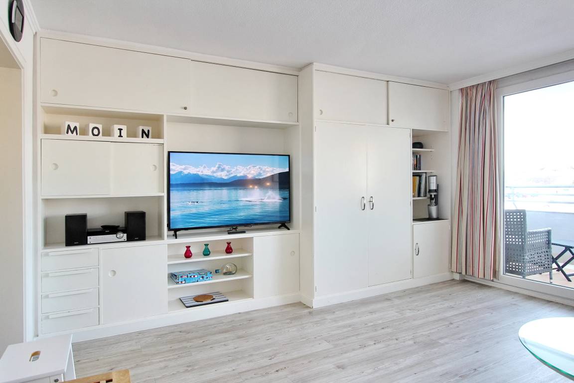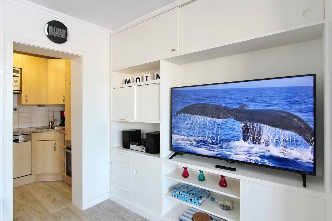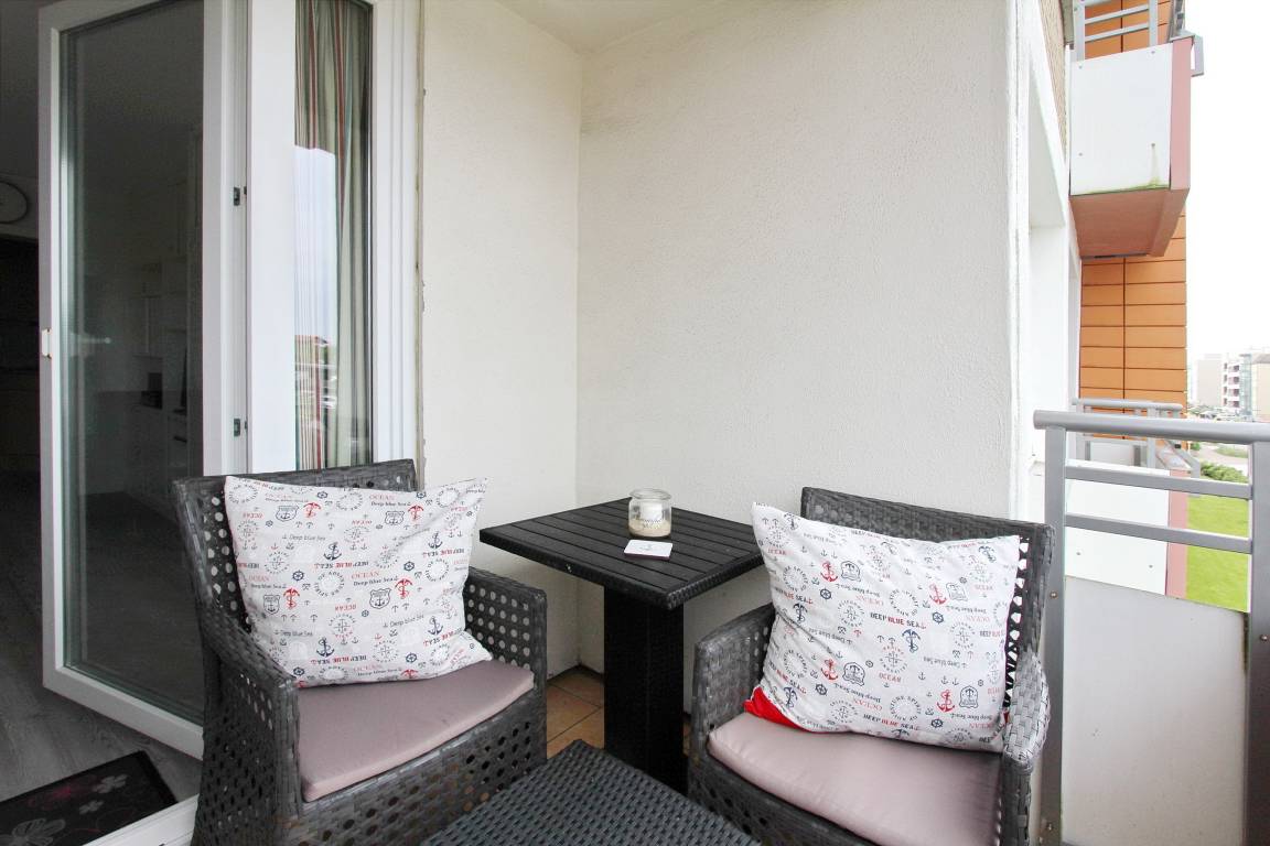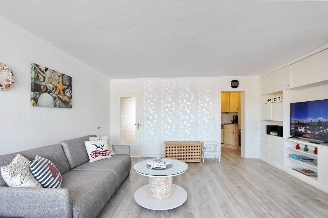 Wunderschöne 2 Zimmerwohnung in der 1. Etage im Haus Brandenburg. Der geräumige Wohnraum wurde mit neuen, modernen Möbeln ausgestattet. Er verfügt über eine großzügige Polsterecke, die zum relaxen einlädt. Abends kann sie mit wenigen Handgriffen in ein Bett verwandelt werden. Am Fenster des Wohnzimmers befindet sich ein großer Esstisch, an dem man bequem mit vier Personen speisen kann. Eine maßgefertigte Schrankwand bietet reichlich Stauraum für Ihre persönlichen Gegenstände. Sie beherbergt auch den neuen 55 Zoll Smart-TV (Bildschirmdiagonale 140 cm). Vom Wohnzimmer aus können Sie den Balkon betreten und auf 2 Rattanstühlen den Sonnenuntergang genießen. Die Wohnung verfügt über einen Satellitenanschluss, so dass Sie alle gängigen Programme auch in HD-Qualität sehen können.