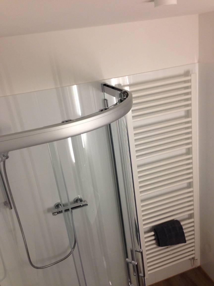 Hochwertiges Duschbad mit Handtuchwärmer und beleuchteten Spiegel.
