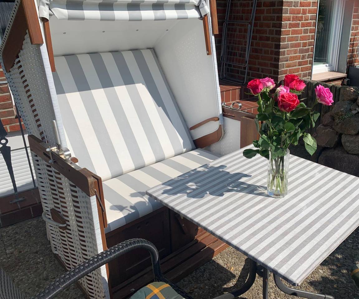 - Auf Ihrer Südterrasse befindet sich ein Strandkorb, Tisch und schöne Korbmöbel.