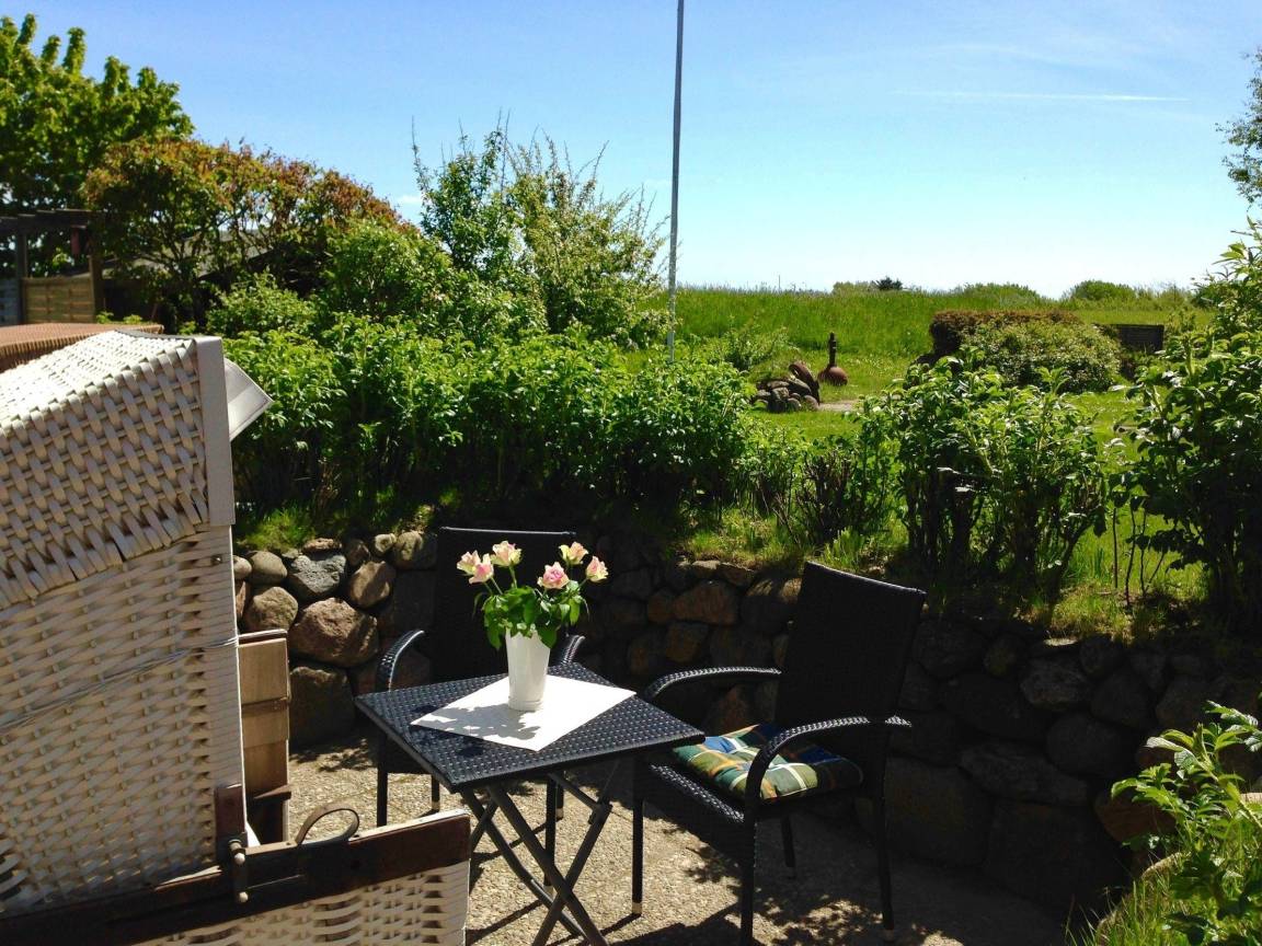 Genießen Sie die Sonne auf der herrlichen Südterrasse im Strandkorb und den schönen Korbmöbeln.