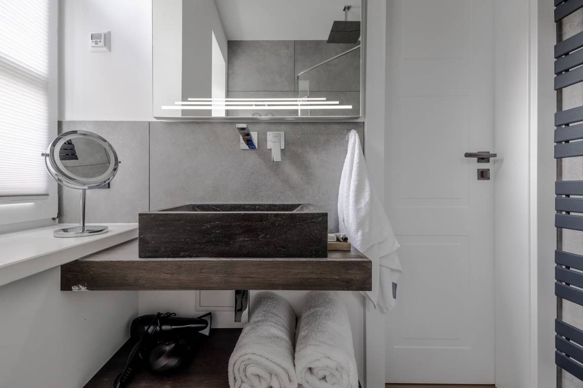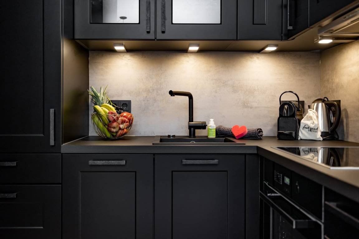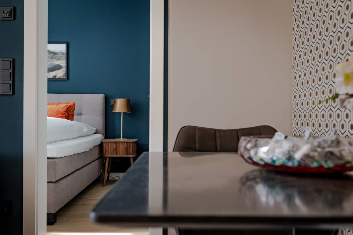 Im separaten Schlafzimmer sorgt ein komfortables Boxspringbett für erholsame Nächte. Das moderne Badezimmer mit großer Regendusche rundet das Wohlfühlambiente ab. Die Fußbodenheizung in der gesamten Wohnung sorgt auch an kühleren Tagen für behagliche Wärme. Bei Anreise erwartet Sie zudem ein kleines Starterpaket für Küche und Bad.