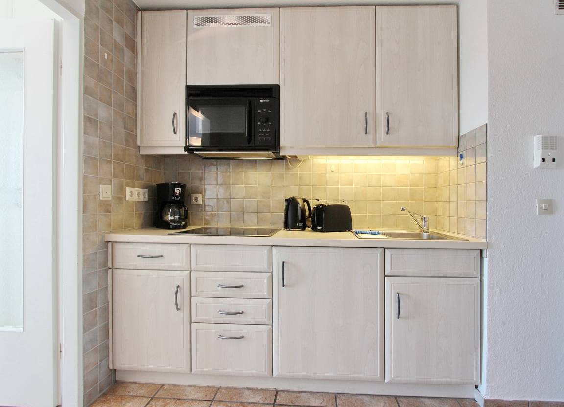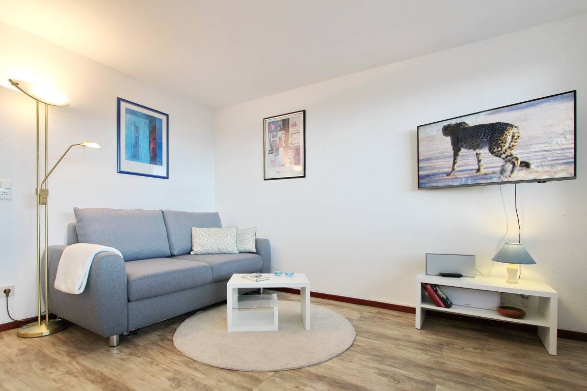 Diese hell und freundlich eingerichtete Nichtraucherwohnung befindet sich in der 3. Etage des Haus Metropol. Der kombinierte Wohn-/Schlafraum hat einen vorgelagerten großen Ostbalkon mit Balkonmöbeln und Auflagen. Es gibt Einzelschrankbetten, einen Essplatz am Fenster mit 2 Stühlen und eine gemütliche Couch. Designfussboden wurde verlegt. Das Badezimmer hat eine Dusche, ein großes Waschbecken, einen Handtuchtrockner sowie einen Fön. In der Einbauküche im Flur mit Cerankochfeld mit 4 Platten und Mikrowellen-Backkombination können sie sich selbst verpflegen. Zur technischen Ausstattung dieser Wohnung gehört ein Flachbildfernseher, ein Radio und ein Wecker. Ein freies WLAN Netzwerk (WEG Haus Metropol - Passwortfrei - ohne Gewähr) steht ihnen kostenfrei zur Verfügung. Wohnungsgröße: 30 m².