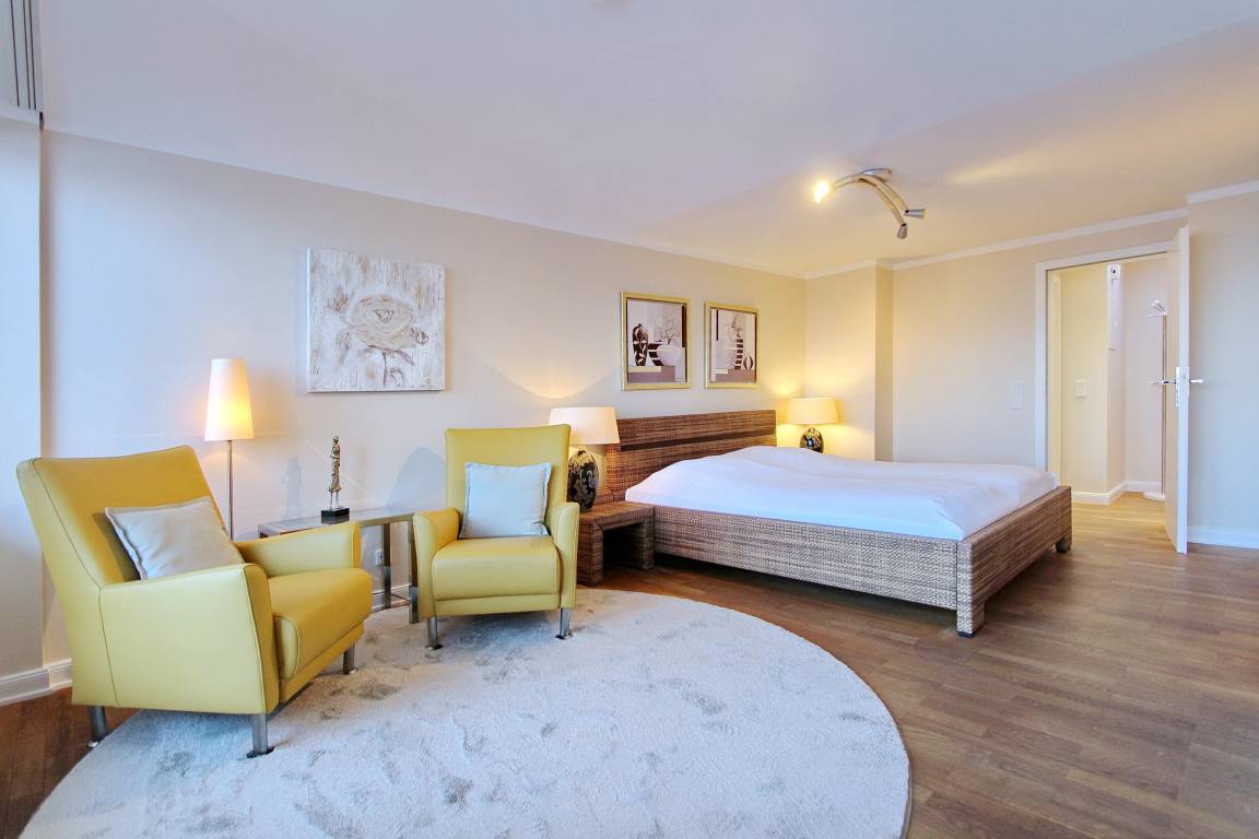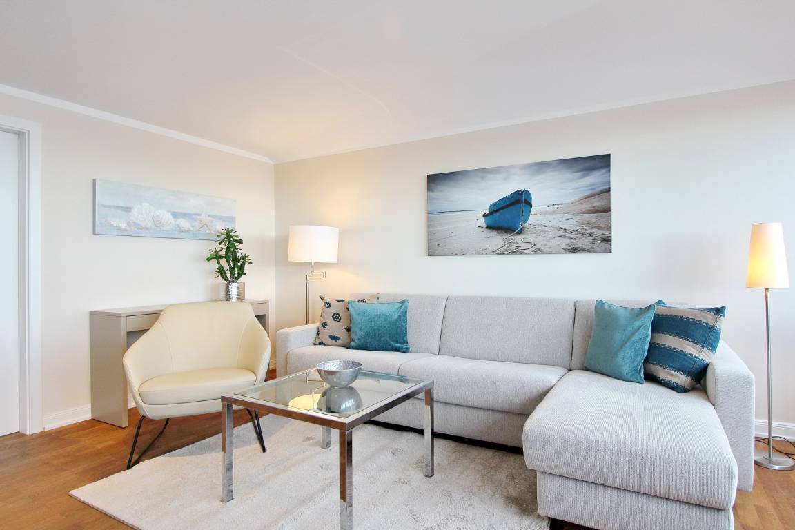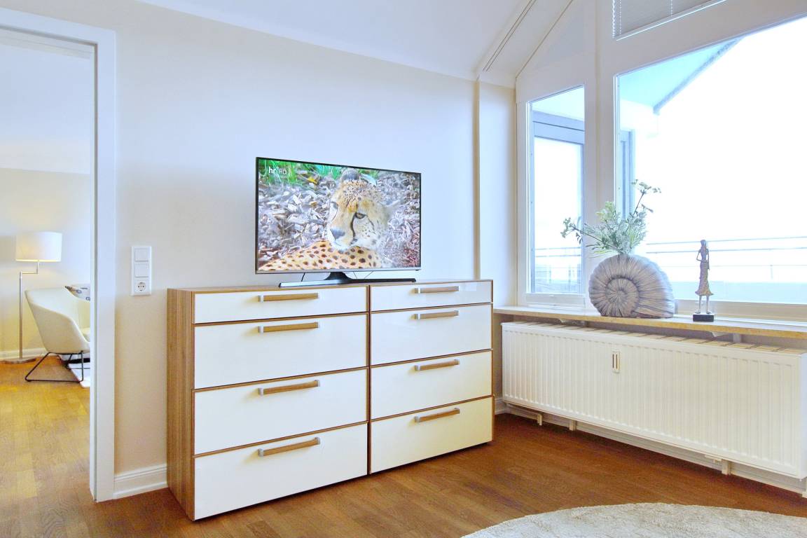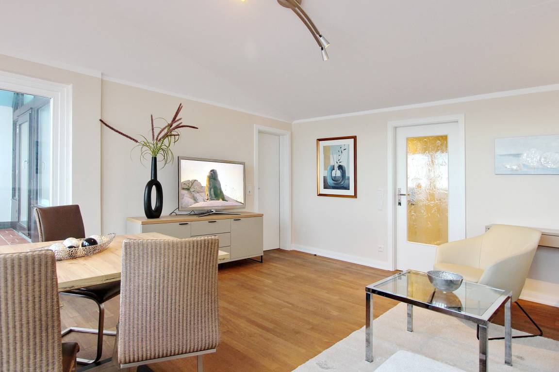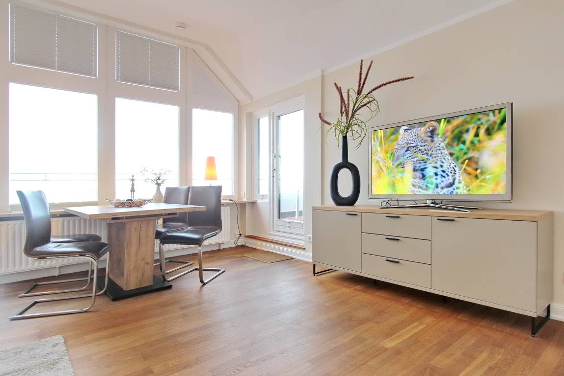 Penthouse-Wohnung in der 10. Etage im Haus Sylter Welle mit schönem Blick auf den Strand und das Meer. Hell und freundlich eingerichteter Wohnraum mit vorgelagerter West-Dachterrasse mit hochwertigen Balkonmöbeln von Kettler. Der Essplatz mit 4 Stühlen steht direkt am Fenster und es gibt eine bequeme Sitzgruppe (mit Schlafcouchfunktion) und einen Sessel. Eine Schrankwand bietet viel Stauraum für ihre persönlichen Dinge. Im Schlafzimmer gibt es ein Doppelbett, 2 Sessel und einen zusätzlichen Flachbildfernseher. Einen sehr großzügigen Kleiderschrank gibt es im Flur. Ein Badezimmer verfügt über eine Badewanne, das Gäste-Bad über eine Dusche. Sep. Einbauküche mit Backofen, Geschirrspüler, zusätzlicher Nespresso Maschine und Mikrowelle. Zur technischen Ausstattung gehört: ein Flachbildfernseher und ein Bluetoothanlage mit CD Spieler von Sony. Das freie WLAN Netzwerk (WEG Haus Sylter Welle - Passwortfrei - ohne Gewähr) steht ihnen kostenfrei zur Verfügung. Das Penthouse ist nur über eine Treppe erreichbar. Der Aufzug geht bis zur 9. Etage. Wohnungsgröße: ca. 60 m².